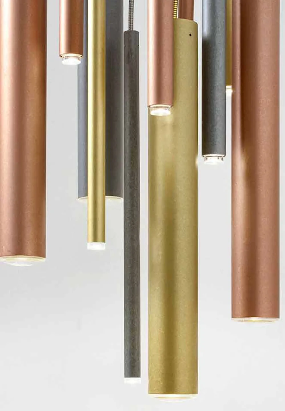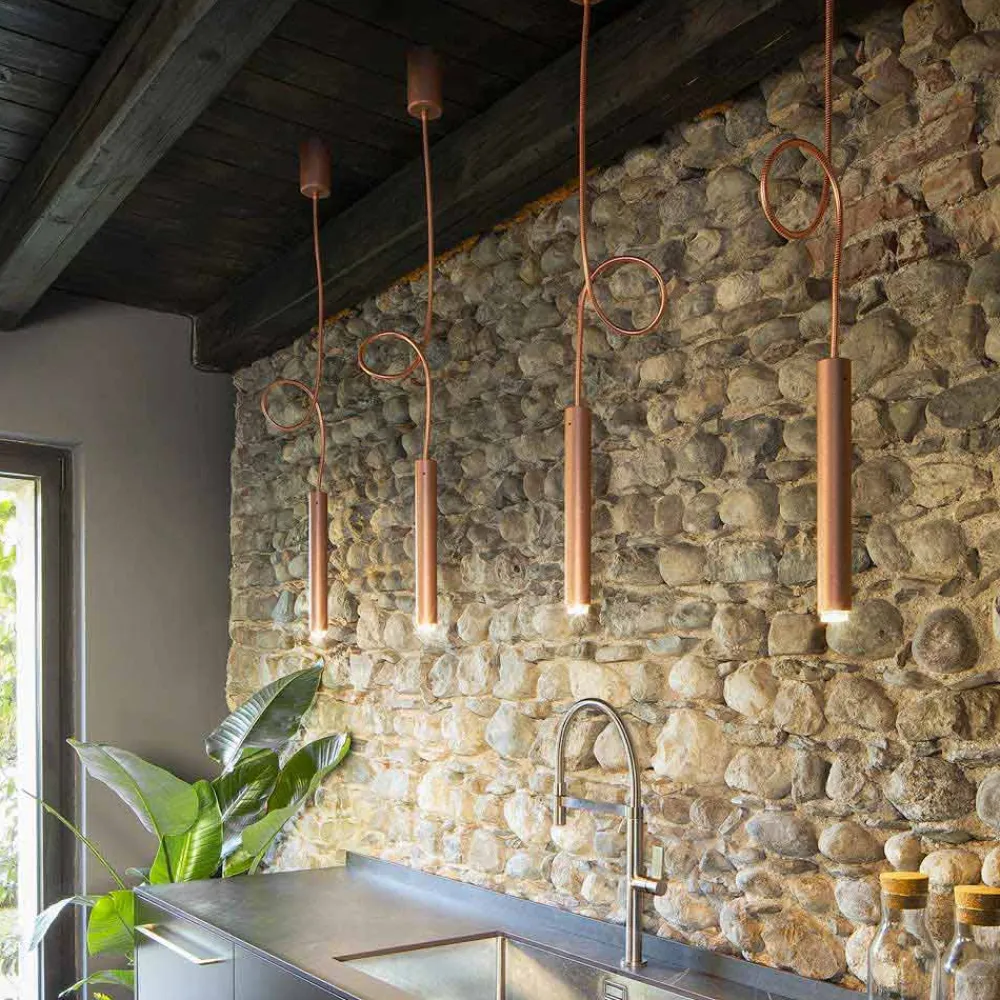 Tubò ist eine raffinierte röhrenförmige Pendelleuchte mit flexiblem Kabel, erhältlich in verschiedenen Materialien und Ausführungen: