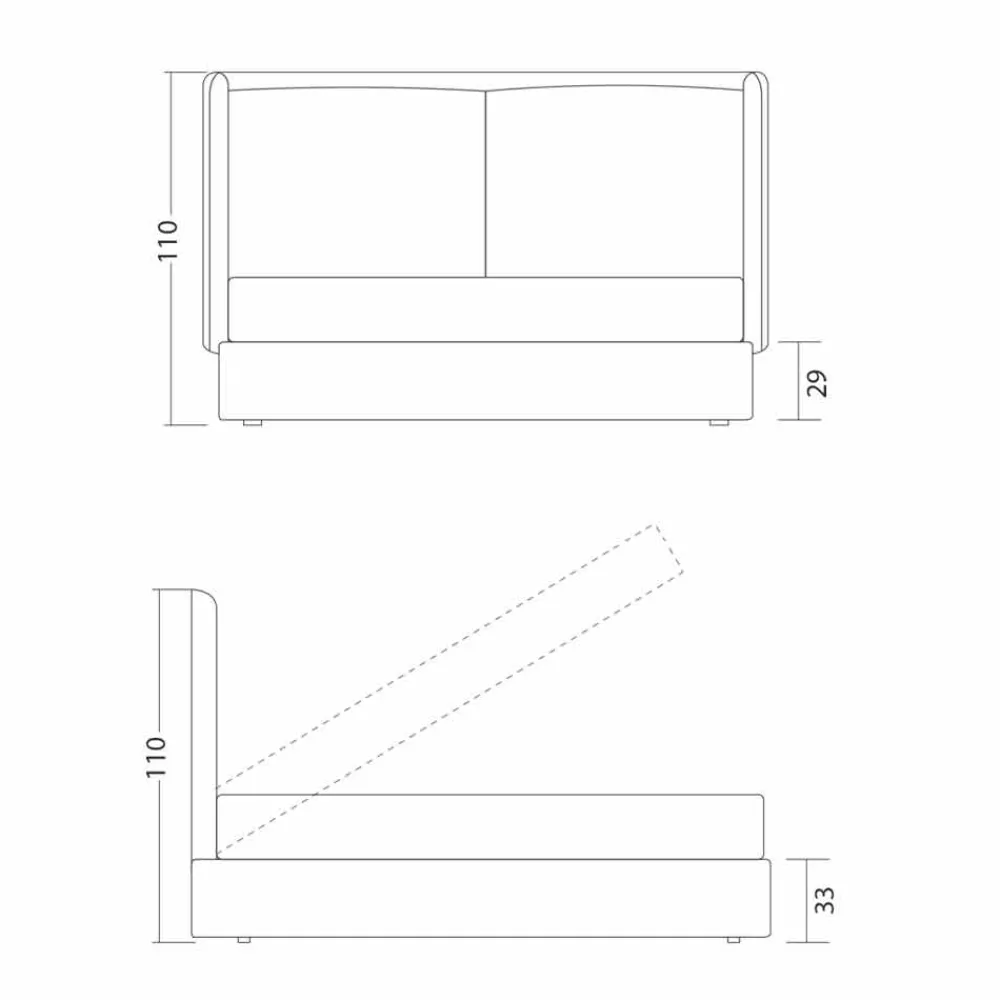 Struktur aus Tannenholz-Blockplatte mit natürlicher Innenoberfläche H. 29 cm, mit Polyurethanschaum ohne Fluorchlorkohlenwasserstoffe gemäß UNI-Normen überzogen und mit lichtbeständigem Velfodera ausgekleidet. Die Böden der Struktur bestehen aus Holzagglomerat mit synthetischer Innenoberfläche in Tannenoptik, letztere werden durch PE- und Rohrprofile gestützt. Lattenrost mit Metallstruktur, gebogener Rahmen mit 50×37 mm Profil, lackiert mit Epoxidpulver. Normaler orthopädischer Lattenrost, gebogene Latten aus Buchensperrholz. Vasenfüße H. 4 cm.