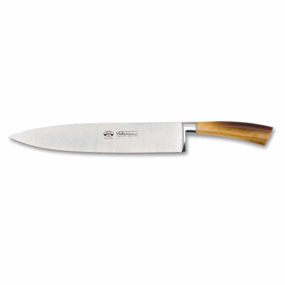Kochmesser: Messer mit mehreren Anwendungen, mit diesem Messer normalerweise groß Sie alle Fleisch schneiden können, aber auch Käse und Gemüse. Die Klingen werden durch Heißschmieden mit einem Hammer erhalten. Dies war einst die einzige Möglichkeit, eine gute Schneidqualität zu gewährleisten (die Schläge des Hammers brechen und ordnen die Moleküle des Stahls). Heute werden sie für ihr schönes und elegantes Aussehen sehr geschätzt. Hergestellt mit einem soliden Griff, dh die Klinge hat den Zapfen im Griff versteckt, sie haben die Oberfläche der Satinklinge.