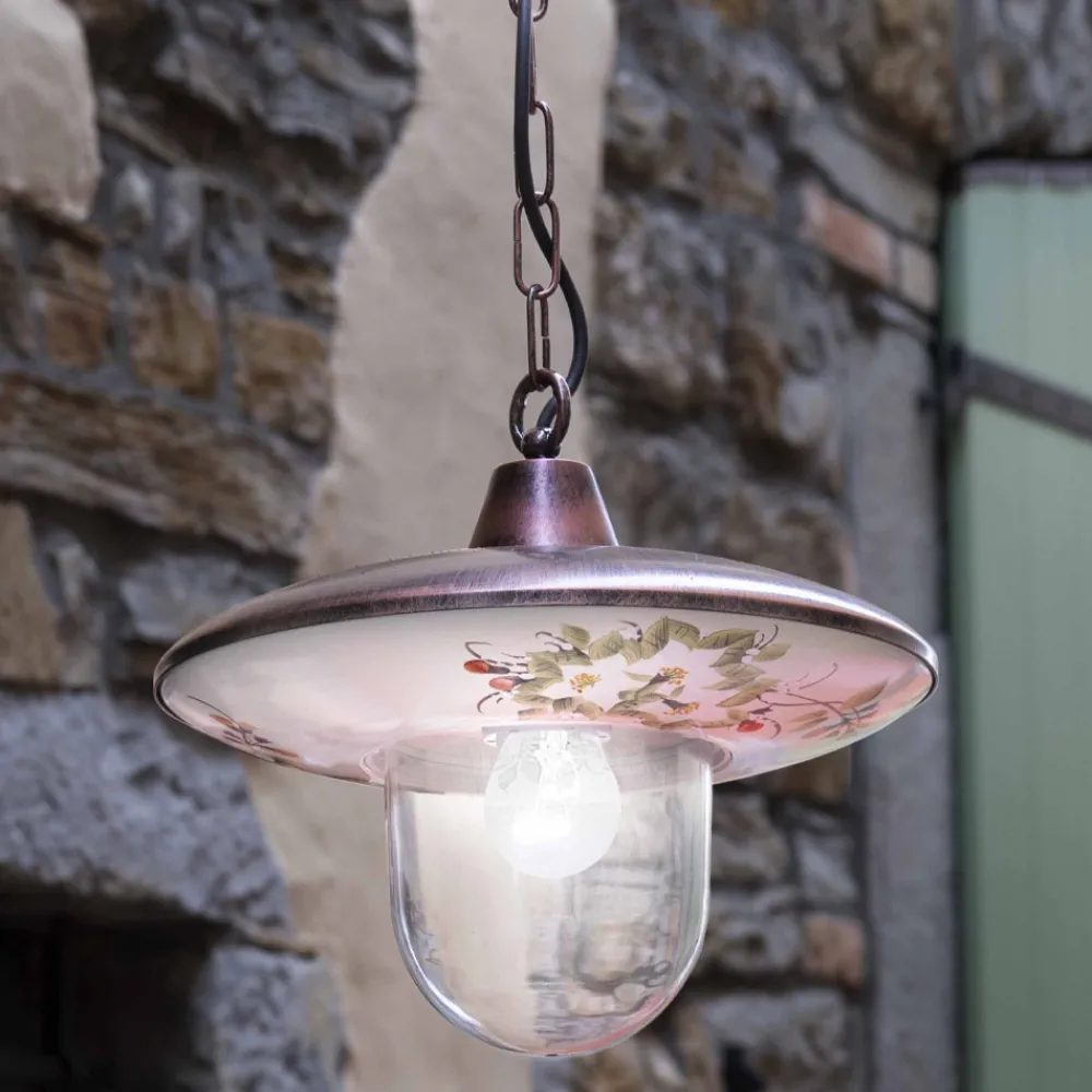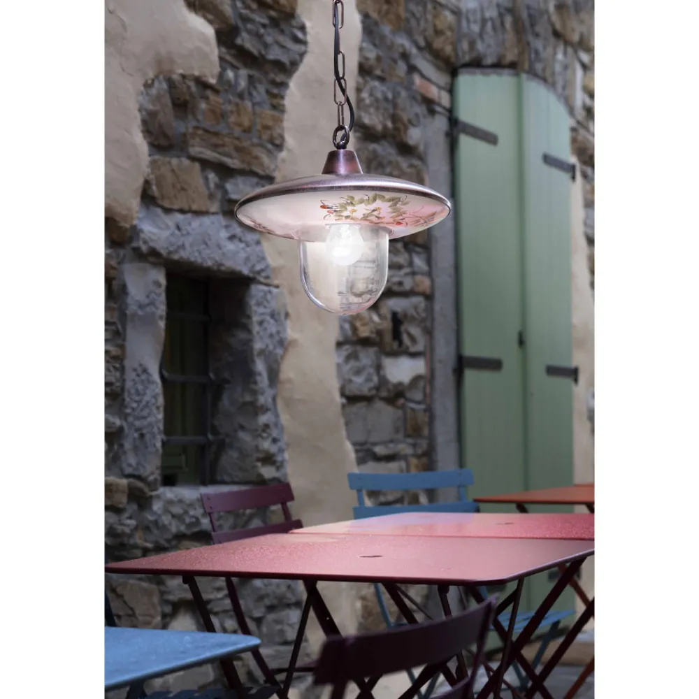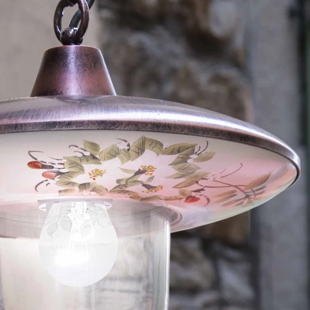 Diese Pendelleuchte für den Außenbereich ist vollständig aus schwarzem Aluminium mit kupferfarbenem Schirm gefertigt und mit handbemalten Blumen für einen klassischen und harmonischen Stil zwischen Form und Farbe verziert.