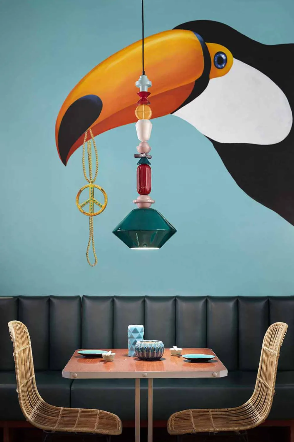 Lariat ist eine einzigartige und besondere Wiedergabe der mehrfarbigen Keramikelemente, die vertikal bis zum zentralen Diffusor aufeinander folgen.
