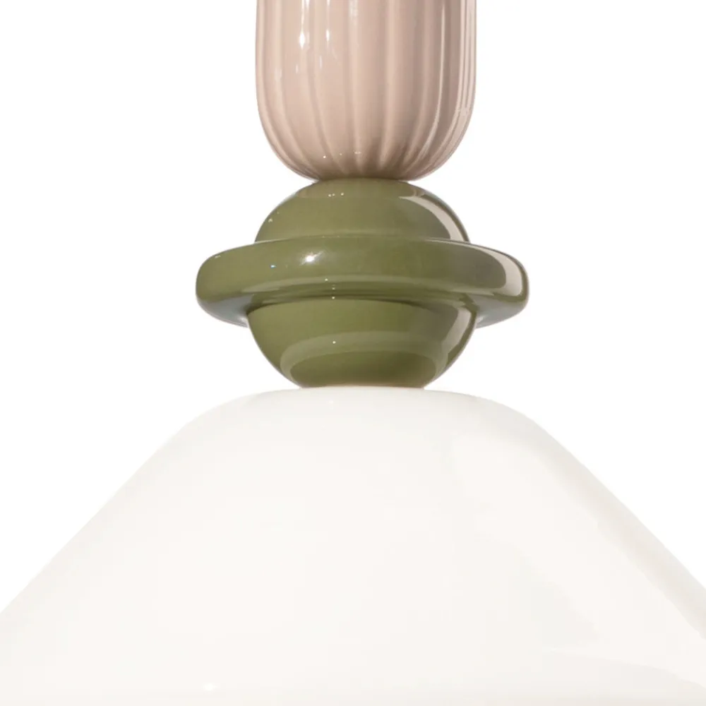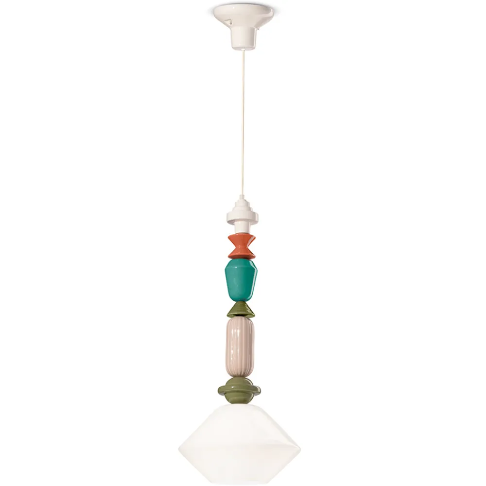 Diese Pendelleuchte ist ein leuchtendes Kunstwerk , das die Wärme von Keramik mit der Transparenz von Glas verbindet. Mit seinen geometrischen Formen und der Abfolge farbiger Elemente sind diese Möbel wie ein Totem aus Licht und Farbe, das jedem Raum Persönlichkeit und Lebendigkeit verleiht.