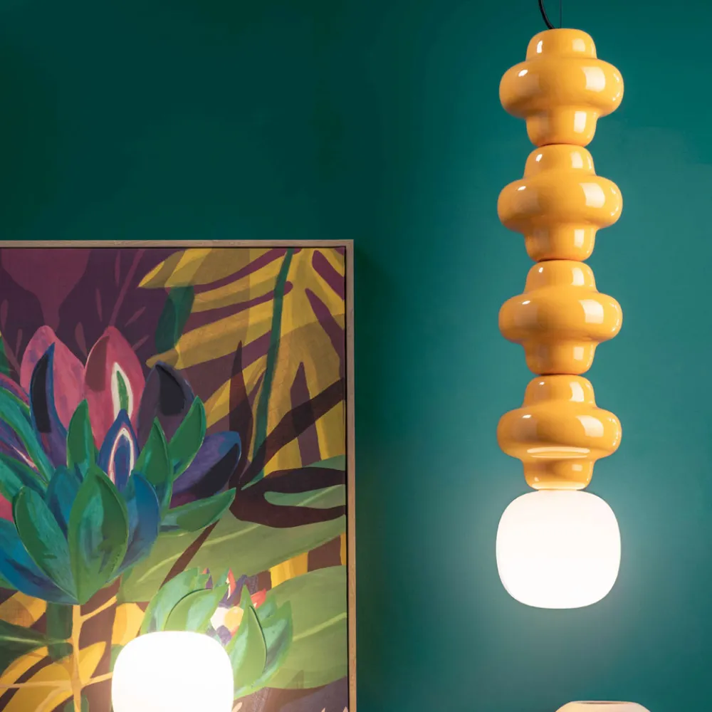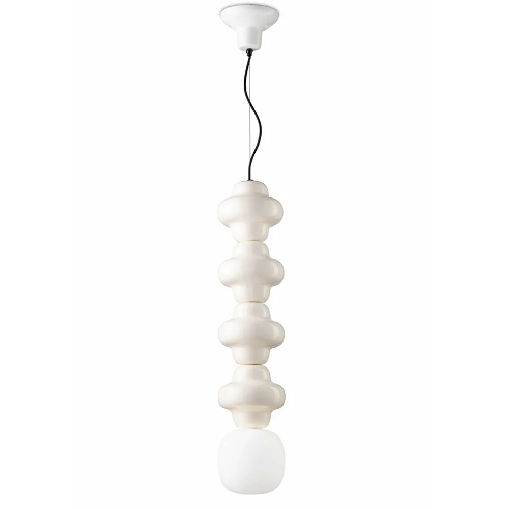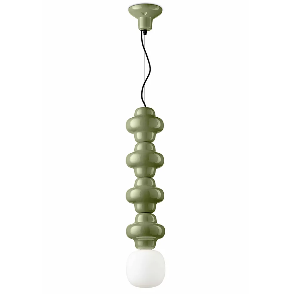 Diese elegante Pendelleuchte verkörpert eine harmonische Verbindung von Handwerkskunst und modernem Design . Perfekt für alle, die die Qualität „Made in Italy“ schätzen. Die Lampe verfügt über einen glänzenden Keramiksockel, der an traditionelle Handwerkskunst erinnert und einen Hauch von Wärme verleiht. Ihr Design wird durch einen Diffusor aus satiniertem Opalglas bereichert, der ein weiches und einladendes Licht erzeugt, ideal, um in jeder Umgebung eine komfortable und entspannende Atmosphäre zu schaffen.