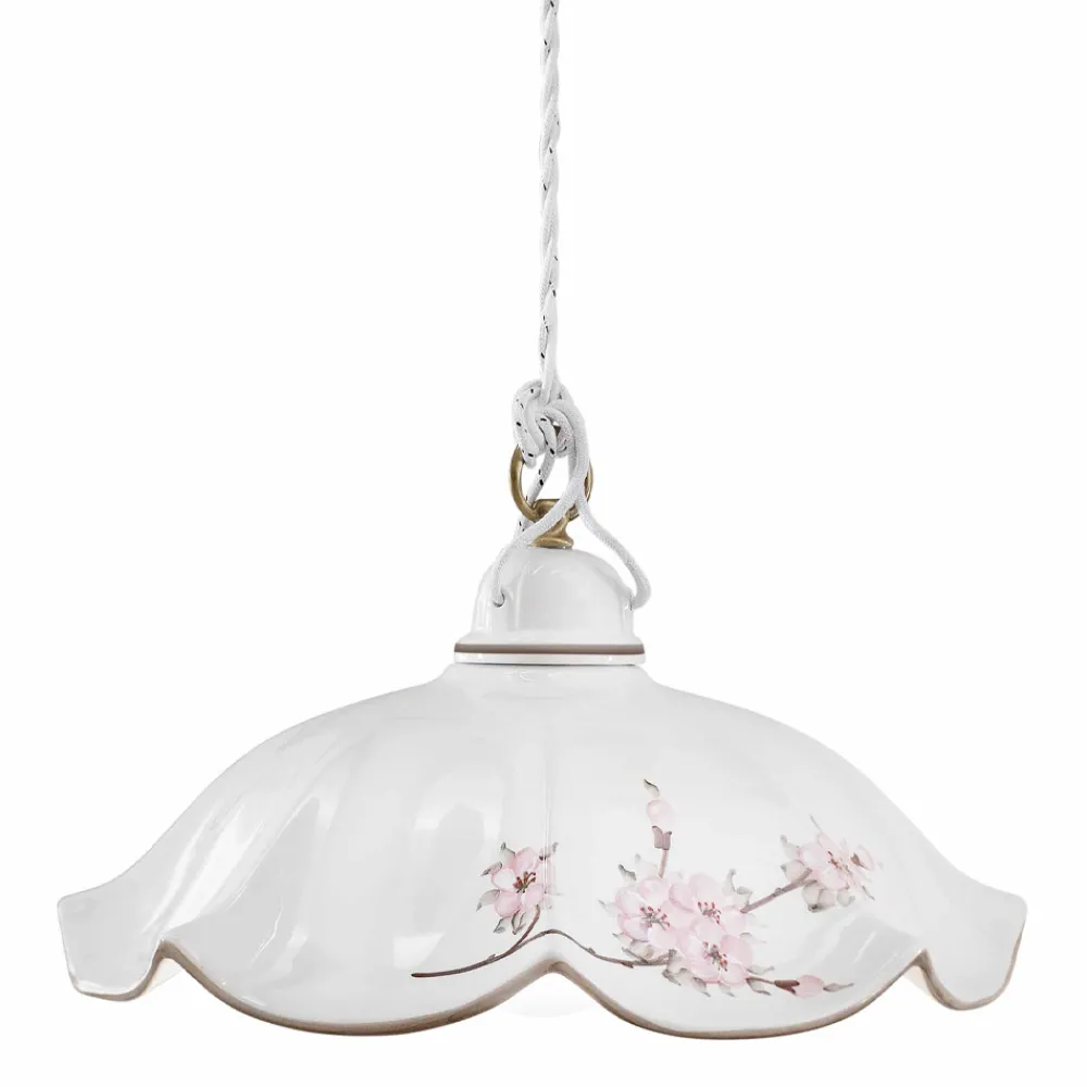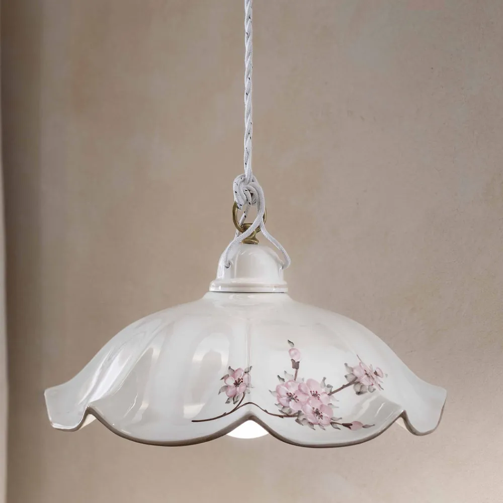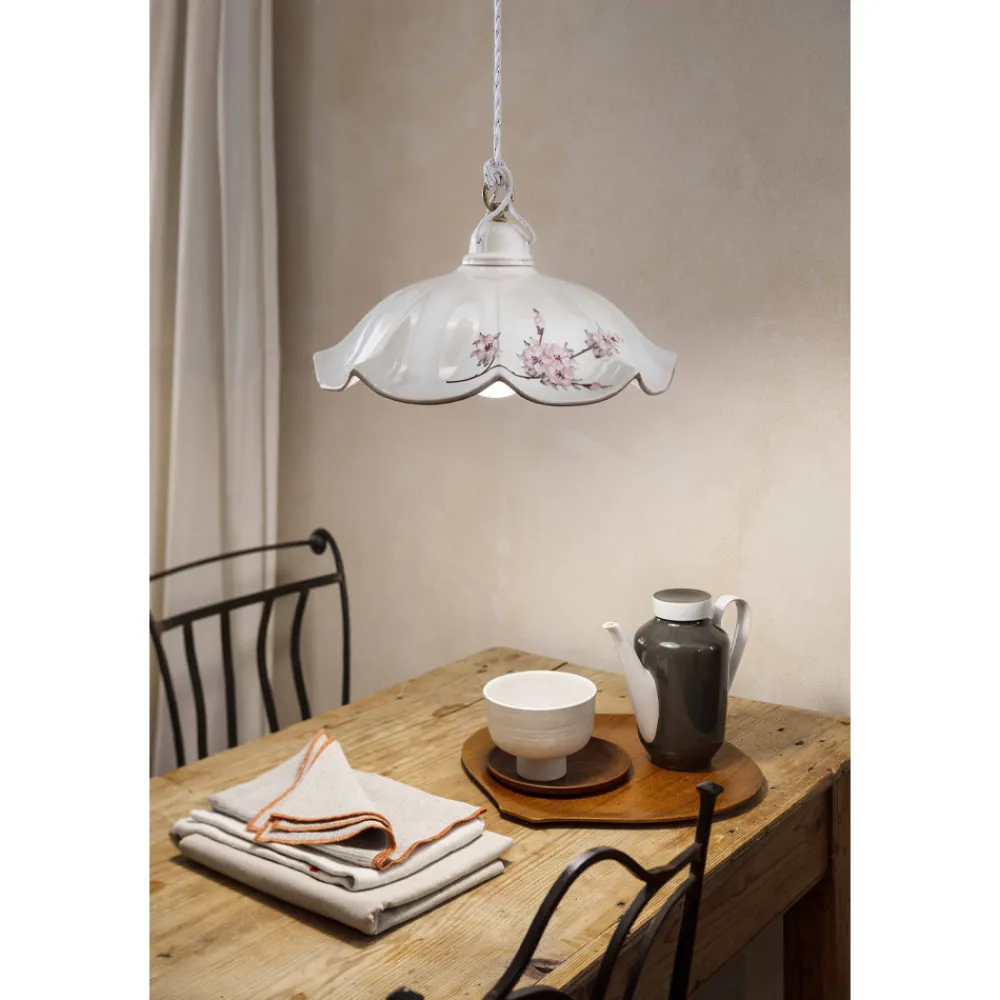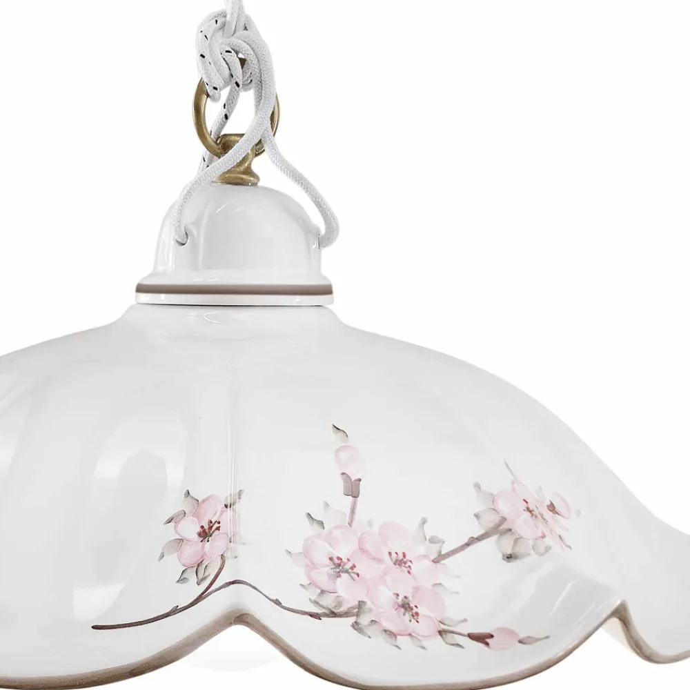 Die Hängelampe besteht vollständig aus Eisen und Keramik mit handgemalten Verzierungen , die die Handwerkskunst und Geschicklichkeit der Handwerker unterstreichen.