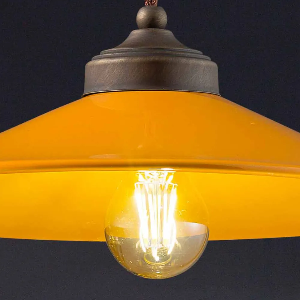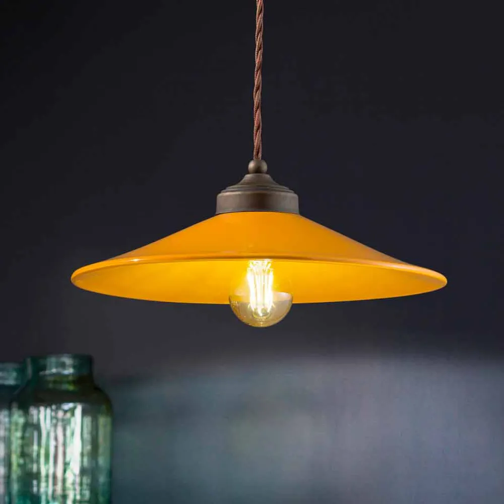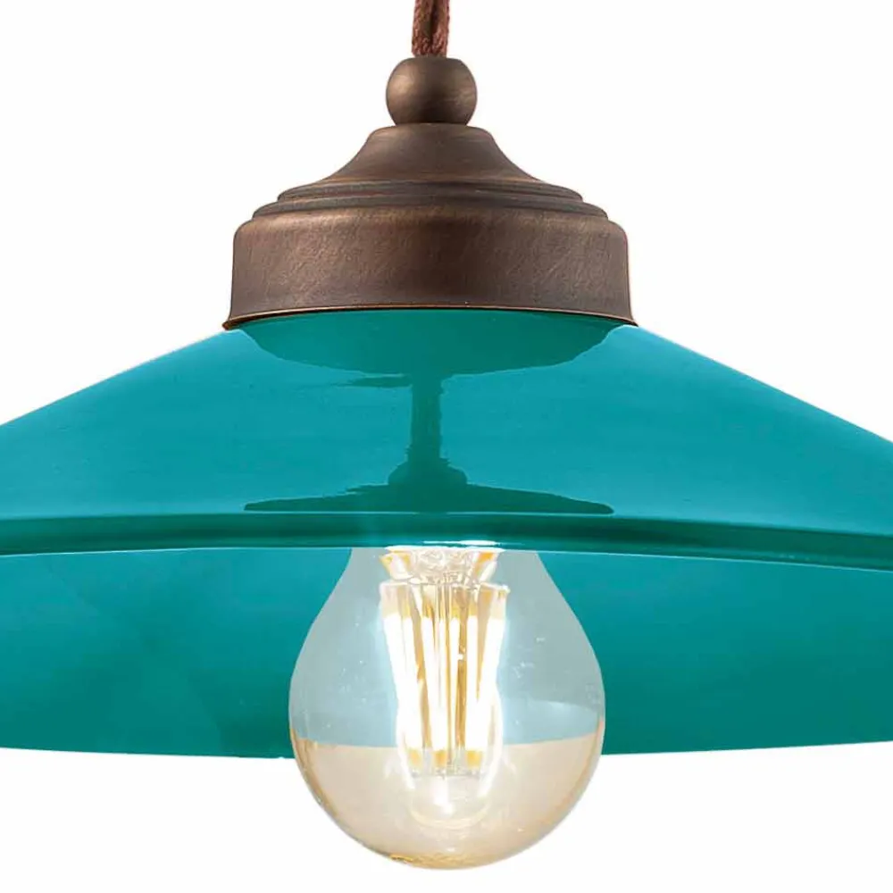 Diese wunderschöne Pendelleuchte besteht aus einer antiken Messingstruktur mit einem Diffusor aus glänzend farbiger Keramik, erhältlich in verschiedenen Farben.