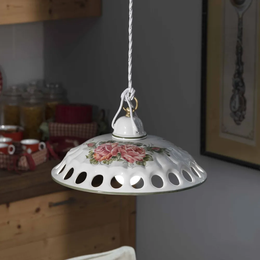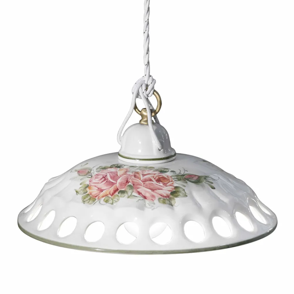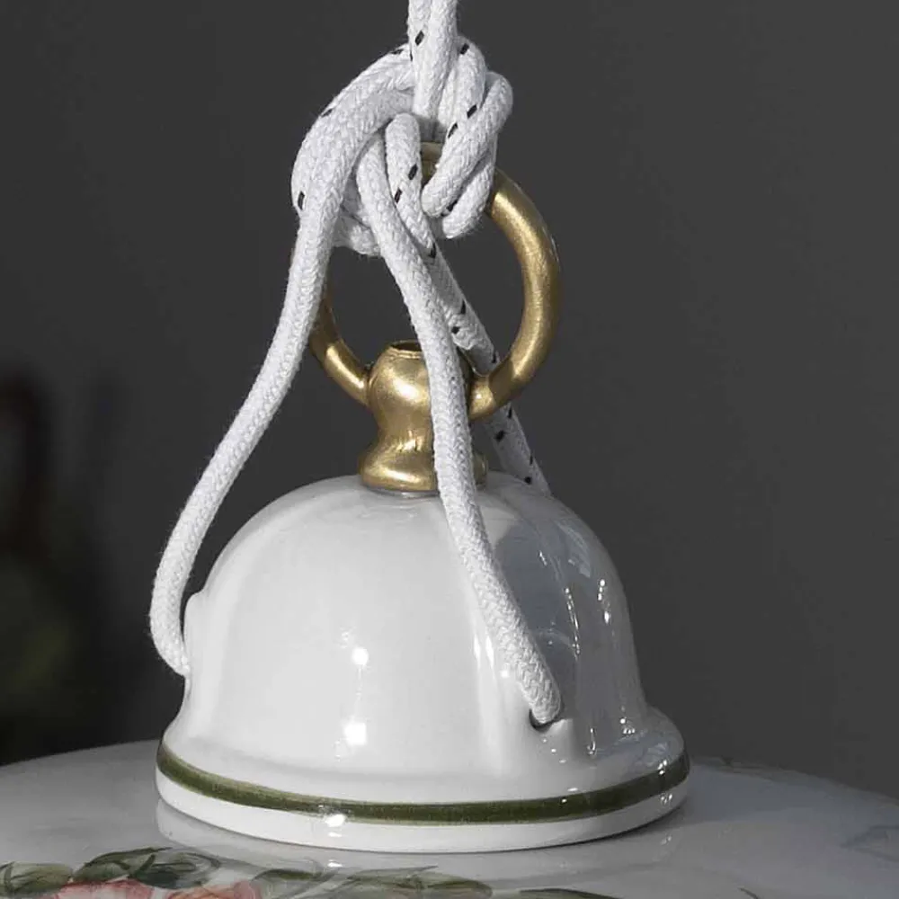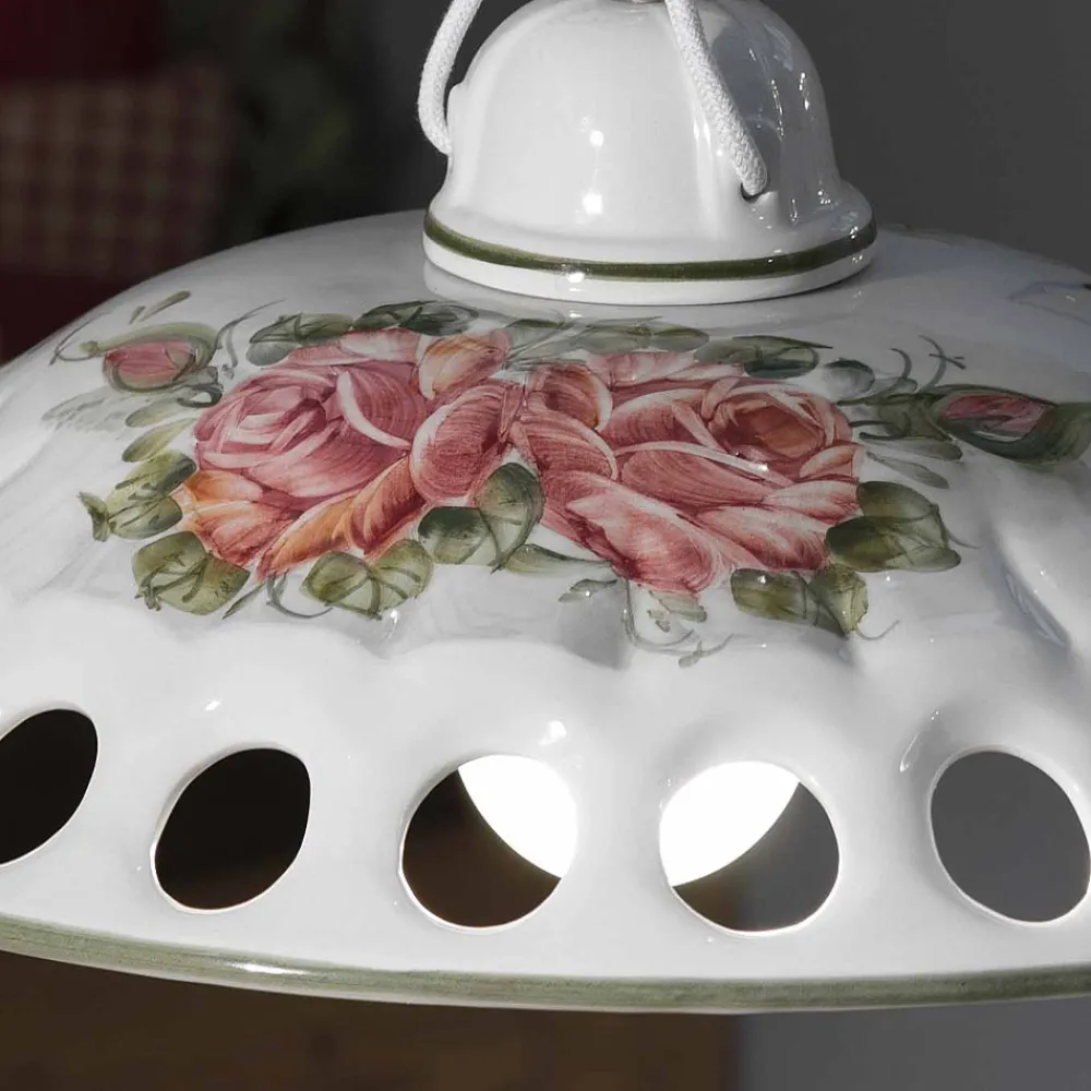 Diese Hängelampe Es besteht vollständig aus Metall und handbemalter Keramik mit Blumendekorationen , die das Können und die Geschicklichkeit der Handwerker unterstreichen.