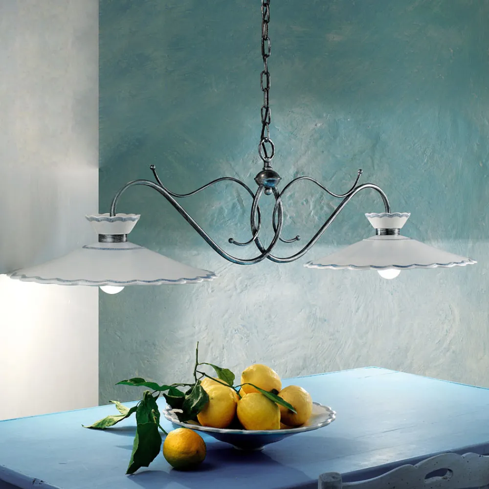 Handgefertigte 2-Licht-Hängelampe aus Metall und Keramik mit Stickereieffekt, 2 Größen, hergestellt in Italien von Ferroluce.