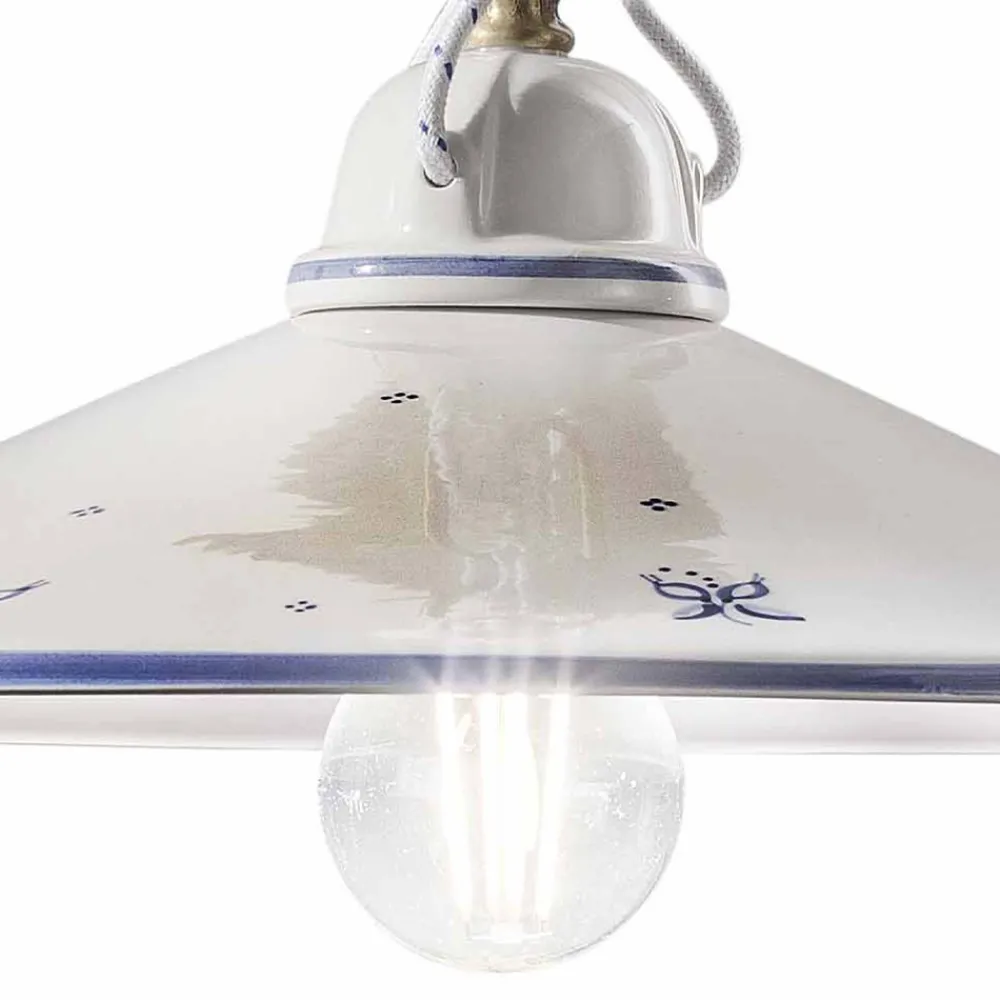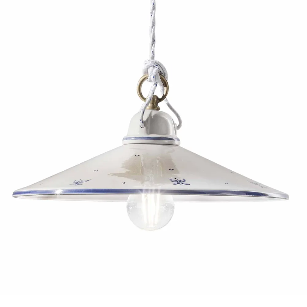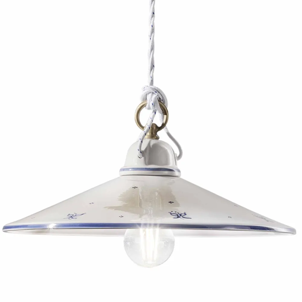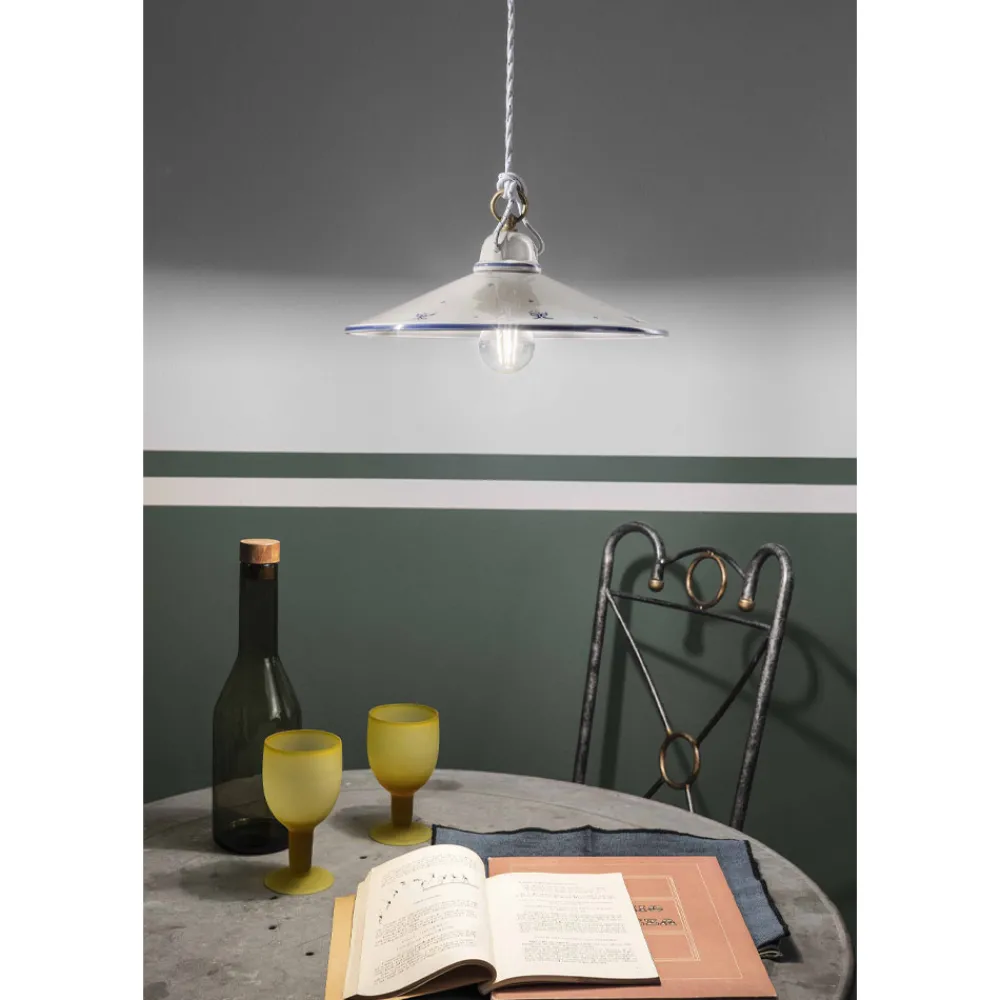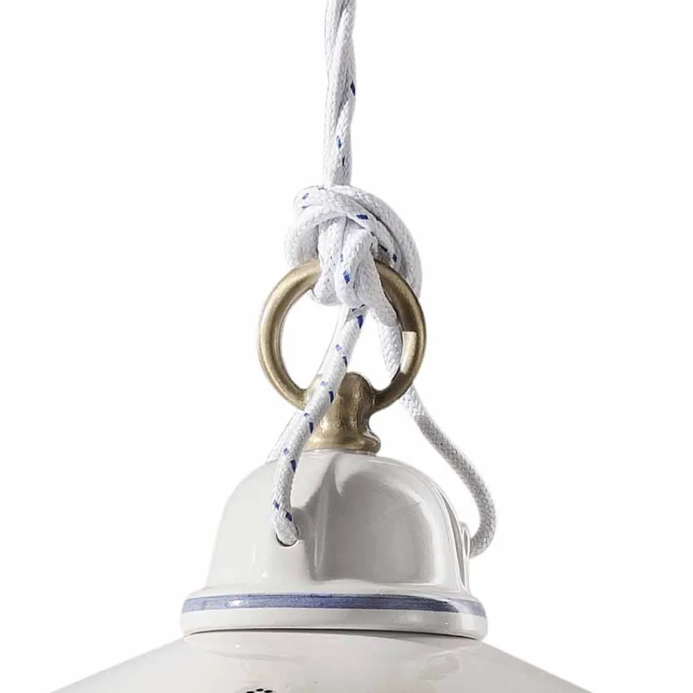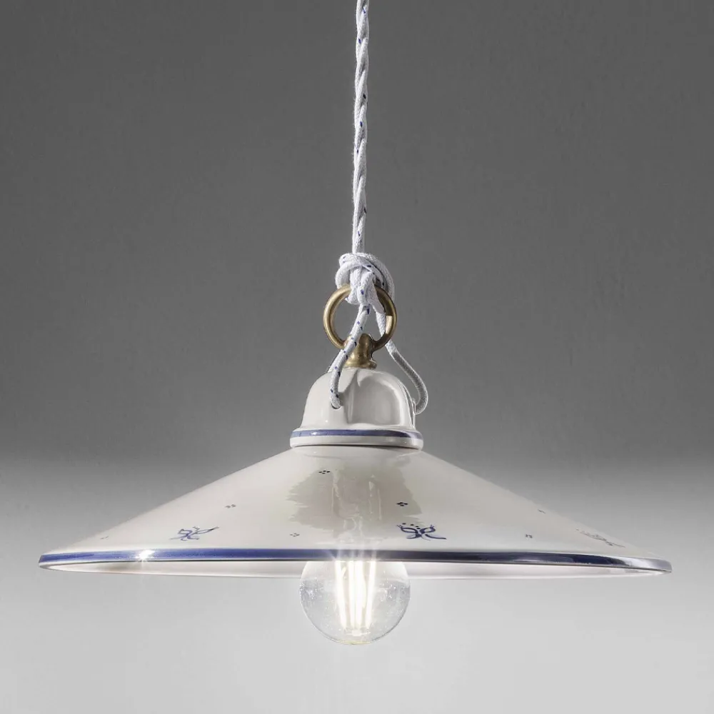 Die Pendelleuchte besteht vollständig aus Eisen und Keramik mit handbemalten blauen Fadenverzierungen die das Geschick und die handwerklichen Fähigkeiten der Handwerker hervorheben.