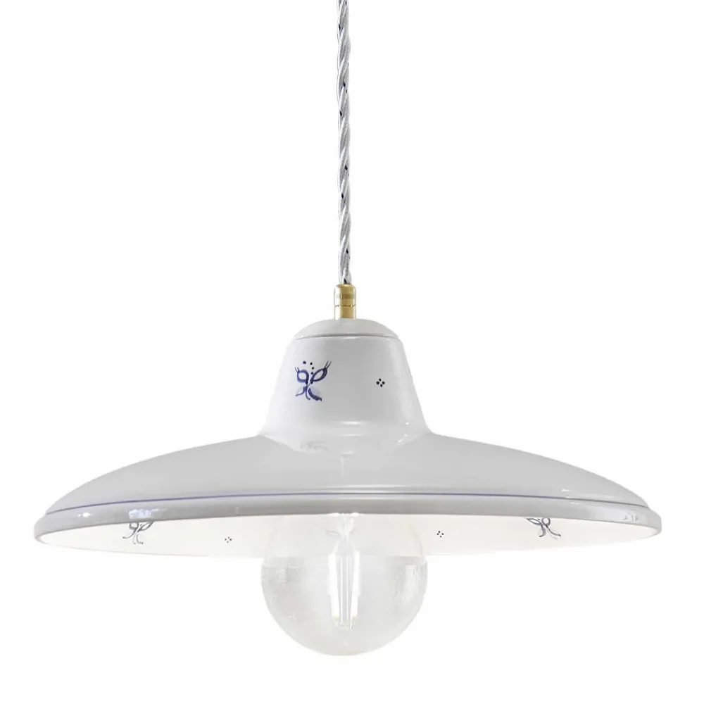 Die Hängelampe besteht vollständig aus Eisen und weißer Keramik mit zarten handgemalten Verzierungen , die die Handwerkskunst und Geschicklichkeit der Handwerker unterstreichen.