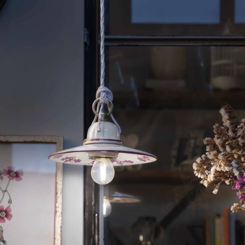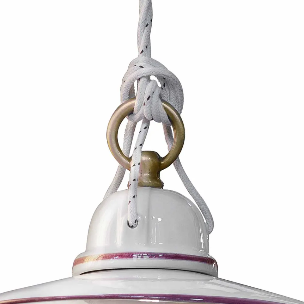 Die Pendelleuchte besteht vollständig aus Eisen und Keramik mit handbemalten roten Fadenverzierungen die das Geschick und die handwerklichen Fähigkeiten der Handwerker hervorheben.