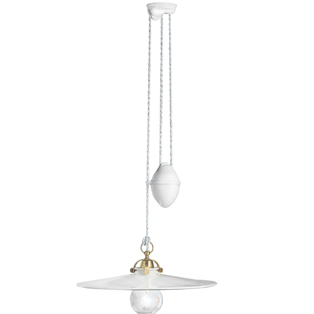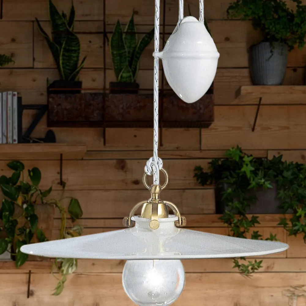 Die Pendelleuchte mit Gleitschiene besteht vollständig aus Eisen und glänzenden Keramikmaterialien die das Geschick und die handwerklichen Fähigkeiten der Handwerker hervorheben.