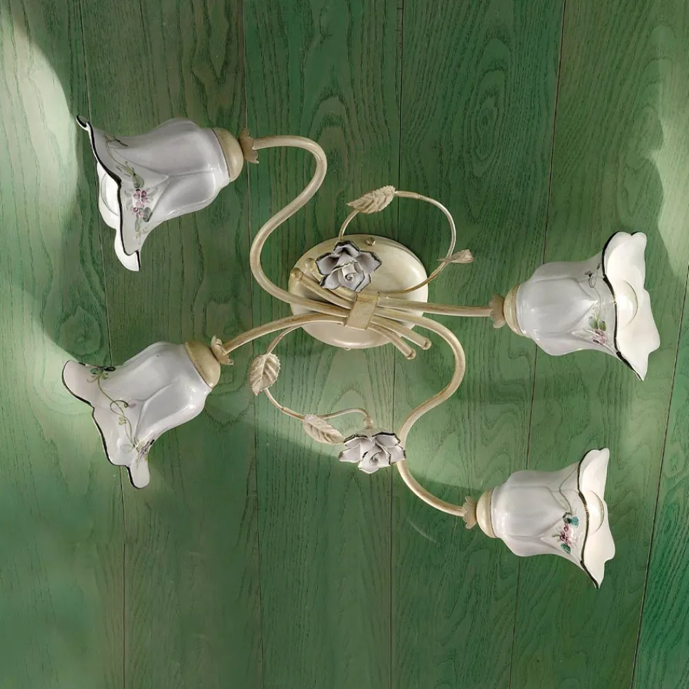 Deckenlampe mit 4 Lichtern aus Metall und Keramik mit handbemalten Rosen, hergestellt in Italien von Ferroluce.