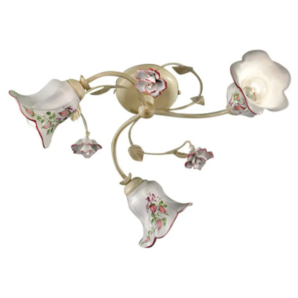 3-flammige Deckenlampe aus Metall und Keramik mit handgemalten Rosen, hergestellt in Italien von Ferroluce.