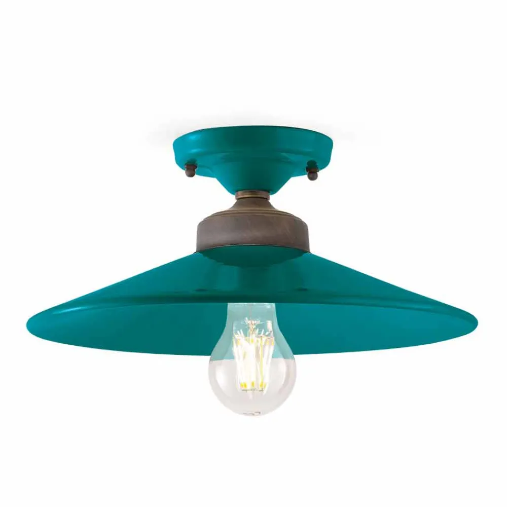 Diese schöne Deckenleuchte besteht aus einer antikisierten Messingstruktur mit einem Diffusor aus glänzend farbiger Keramik, der in verschiedenen Farben erhältlich ist.