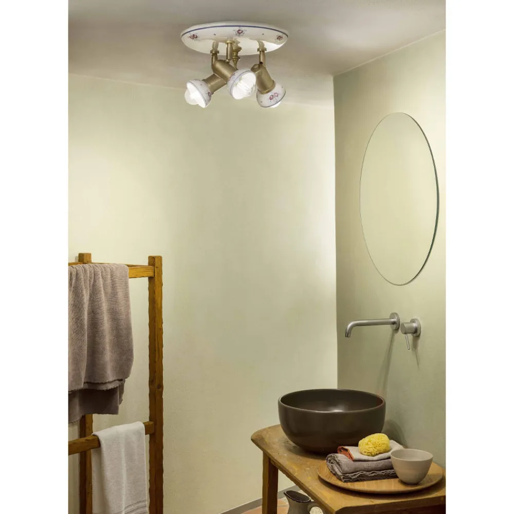 Diese 3-Punkt-Deckenleuchte im runden Design ist vollständig gefertigt in Messing und Keramik mit handgemaltem Blumendekor, um das Geschick und die handwerklichen Fähigkeiten der Handwerker hervorzuheben.