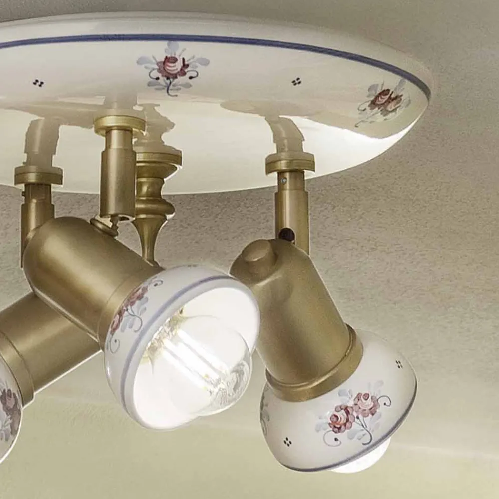 Runde 3-flammige Deckenlampe aus Messing und handbemalter Keramik, hergestellt in Italien von Ferroluce.