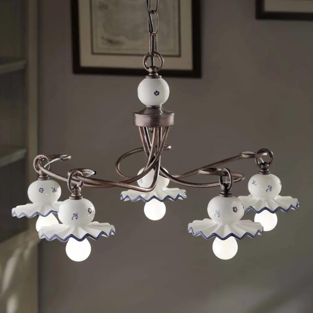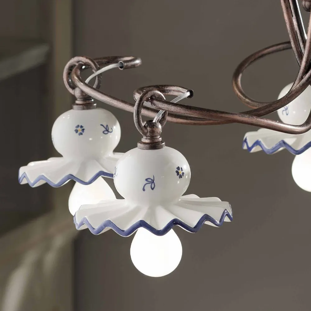 Handgefertigter Kronleuchter aus Metall und handbemalter Keramik, hergestellt in Italien von Ferroluce.