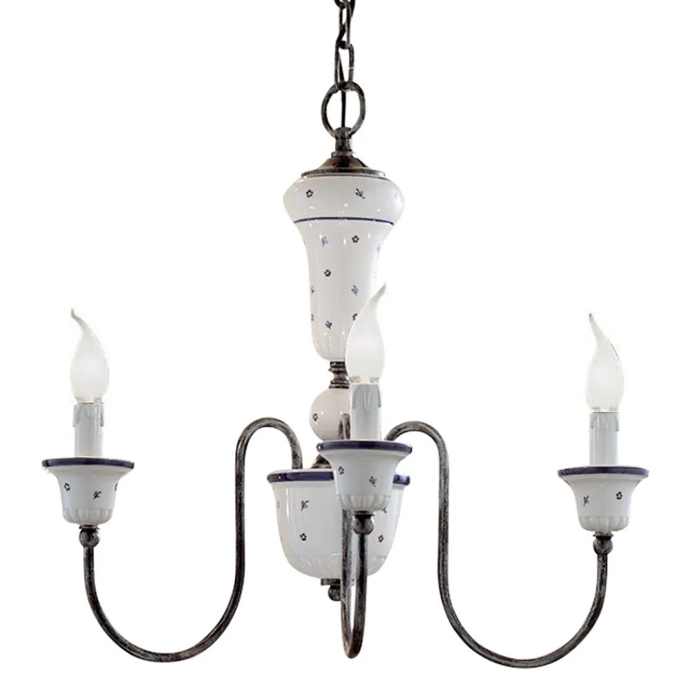 Handwerklicher 3-flammiger Kronleuchter aus Messing und handbemalter Keramik, hergestellt in Italien von Ferroluce.