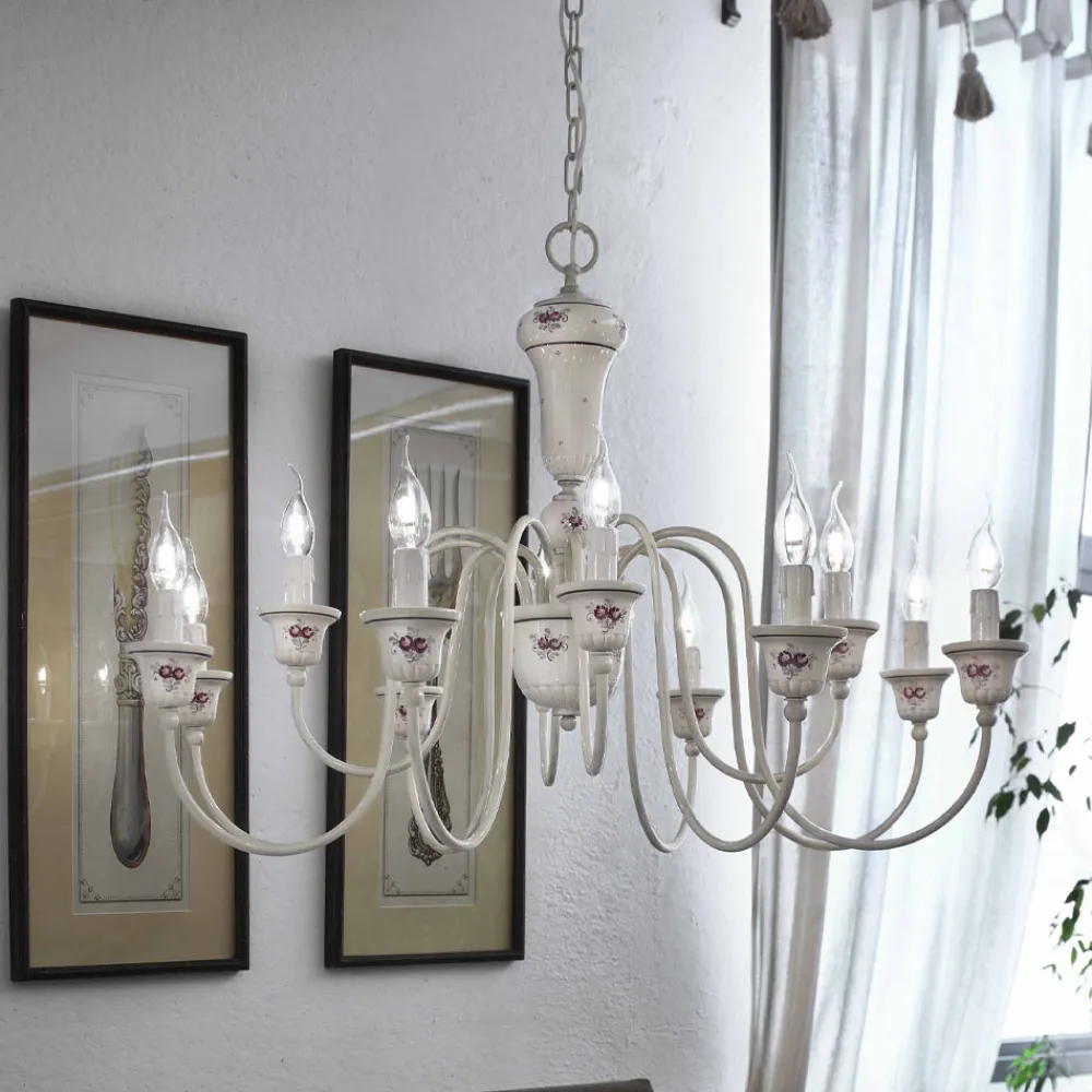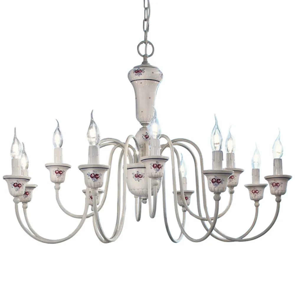 Handgefertigter 12-flammiger Kronleuchter aus Messing und handbemalter Keramik, hergestellt in Italien von Ferroluce.