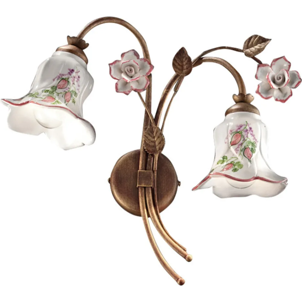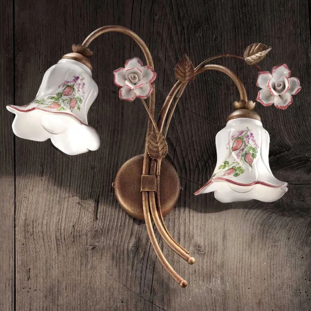 Wandlampe mit 2 Leuchten aus Metall und Keramik mit handbemalten Rosen, hergestellt in Italien von Ferroluce.