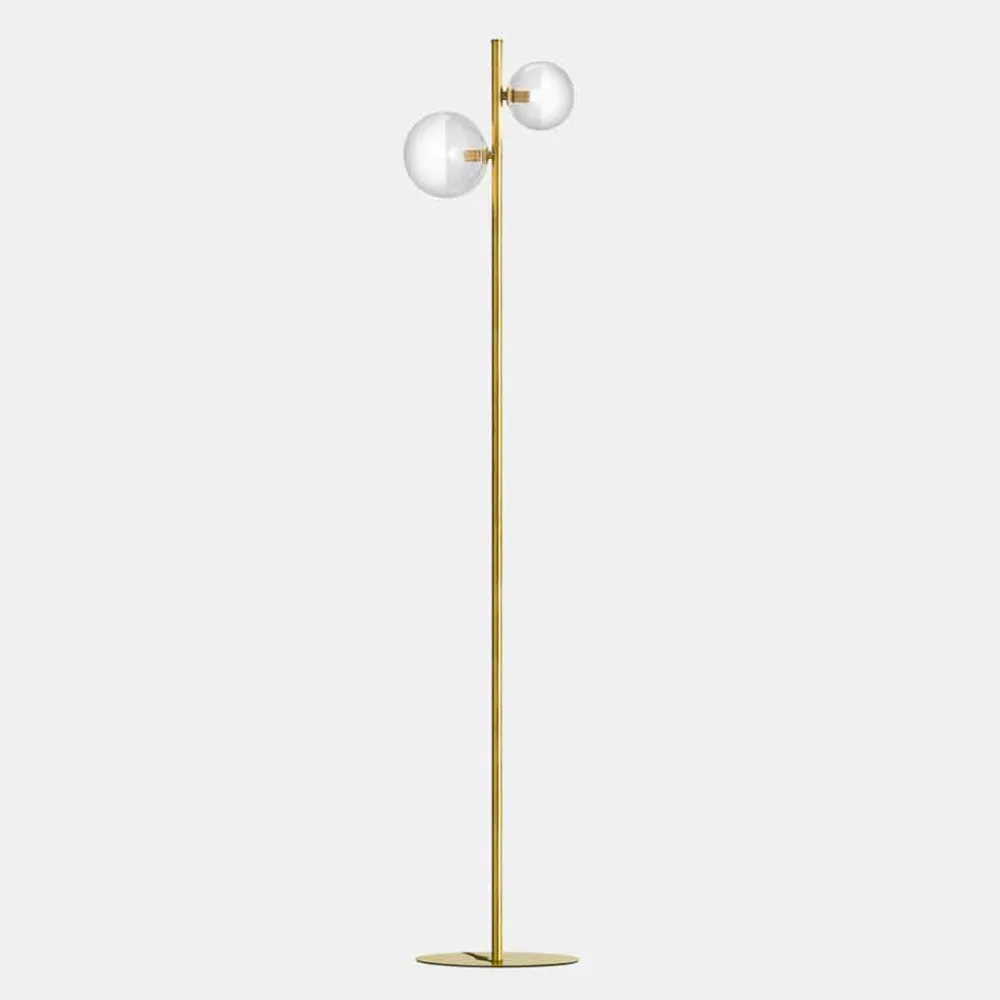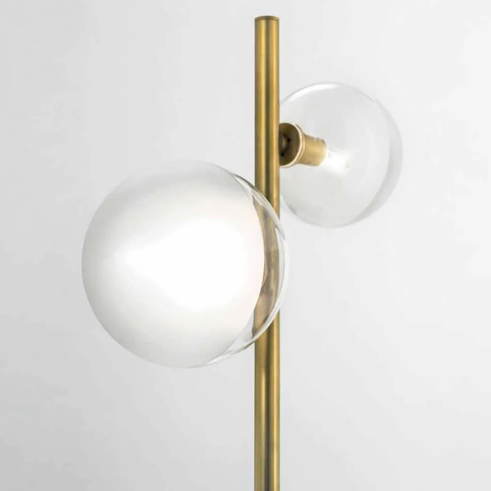 Diese Stehlampe für den Innenbereich hat ein elegantes und raffiniertes Design aus natürlichem Messing mit transparenten und sandgestrahlten Glaskugeln.