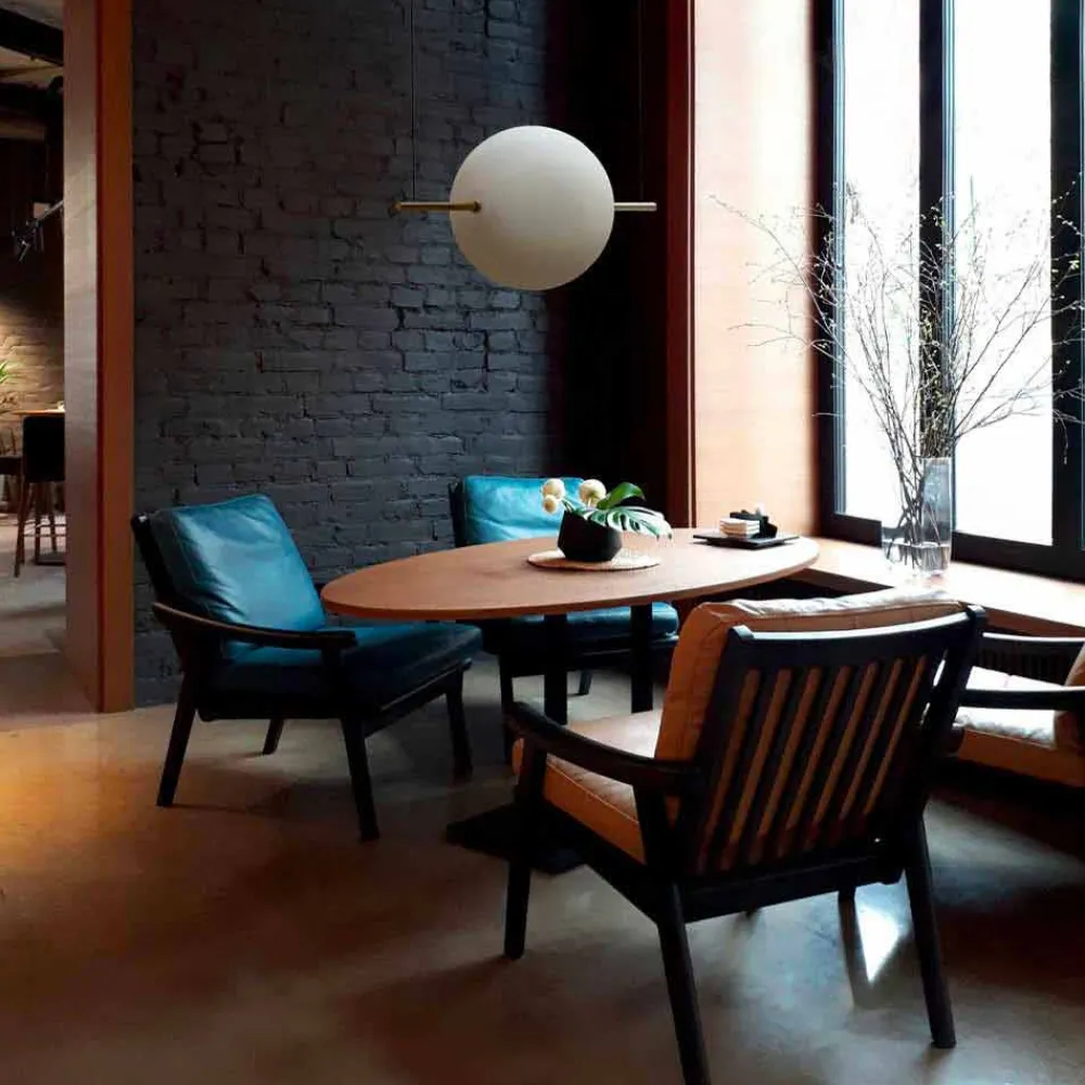 Bestehend aus einer stimmungsvollen Verschmelzung von Borosilikatglas und einem schwarzen oder gebürsteten Messinggehäuse , verleiht die ausgewogene Geometrie der Umgebung ein Gefühl von Leichtigkeit und Stabilität.