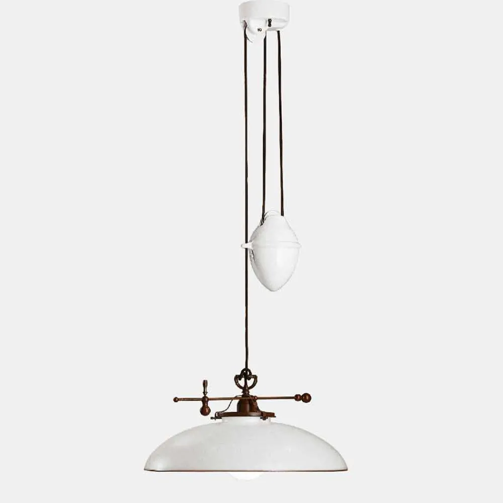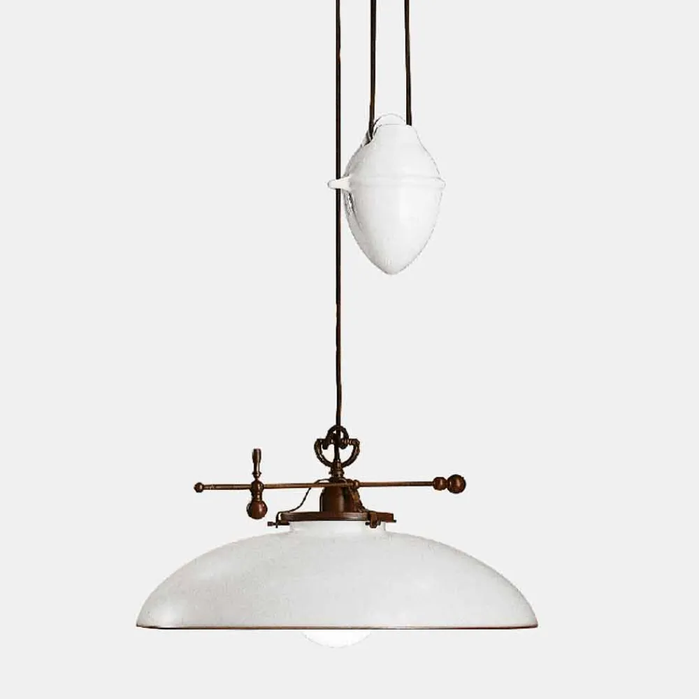Pendelleuchte aus Messing und Muranoglas mit Halbkugel und Gegengewicht aus Keramik, hergestellt in Italien.