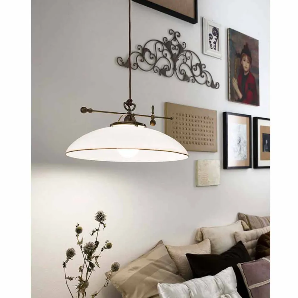 Es ist eine Up and Down Pendelleuchte im Landhausstil aus Messing und weißem mundgeblasenem Muranoglas, ein großartiger Ausdruck von Made in Italy.