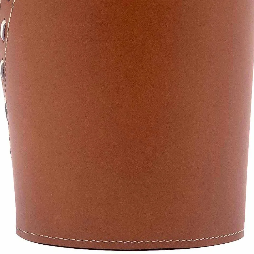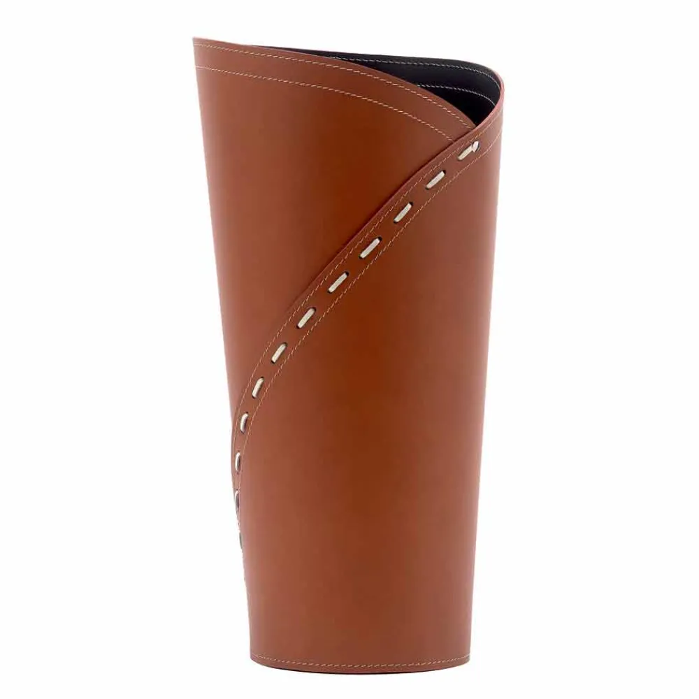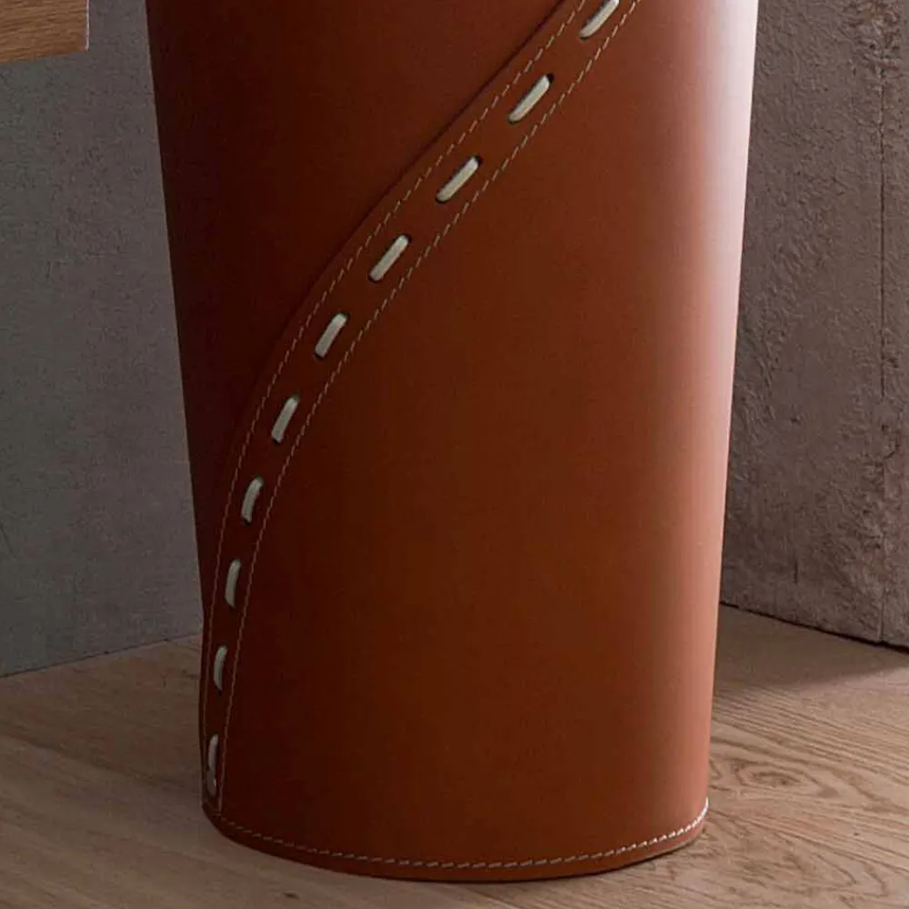 Der Schirmständer Katrina besteht aus regeneriertem Leder, das sowohl die äußeren als auch die inneren Oberflächen bedeckt. Die sichtbare Naht ist ein elegantes Detail, das dazu beiträgt, einer rein funktionalen Ergänzung einen dekorativen Wert zu verleihen.