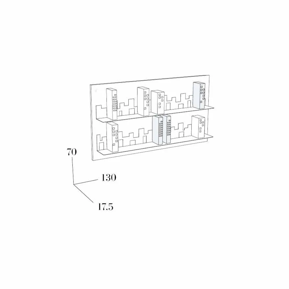 Ein Bücherschrank aus lackiertem Eisen, die nicht nur als Bücher behälter benutzt wirt, aber ein richtiges Dekor Zubehör. Wie ein Bild auf der Wand, Skyline wiederstellt das Profil eines modernes Metropole: seine
