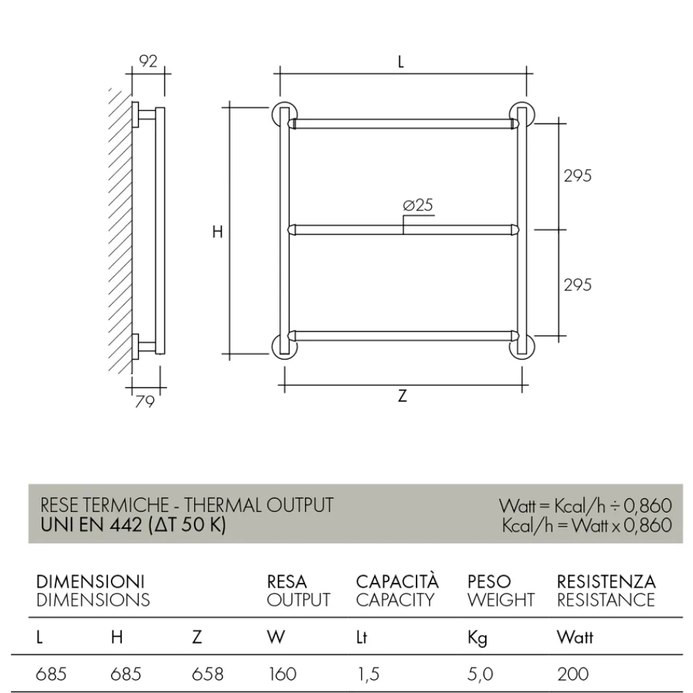 | Maße | L. 685 mm, H. 685 mm, Radstand 658 mm; Elektrische Heizung 200 Watt; Kapazität 1,5 Lt; Gewicht 5,0 kg |