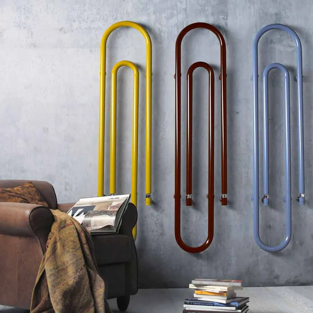 Heizkörper in Form einer farbigen vertikalen Büroklammer, in der hydraulischen Version, mit modernem und lustigem Design. Das Thema ist die Erweiterung der Form von Alltagsgegenständen und ihre Funktionsänderung in einem Spiel der sofortigen Erkennung und Annehmlichkeit. Erhältlich in verschiedenen Farb- und Größenvarianten, wählen Sie die für Sie am besten geeigneten aus!