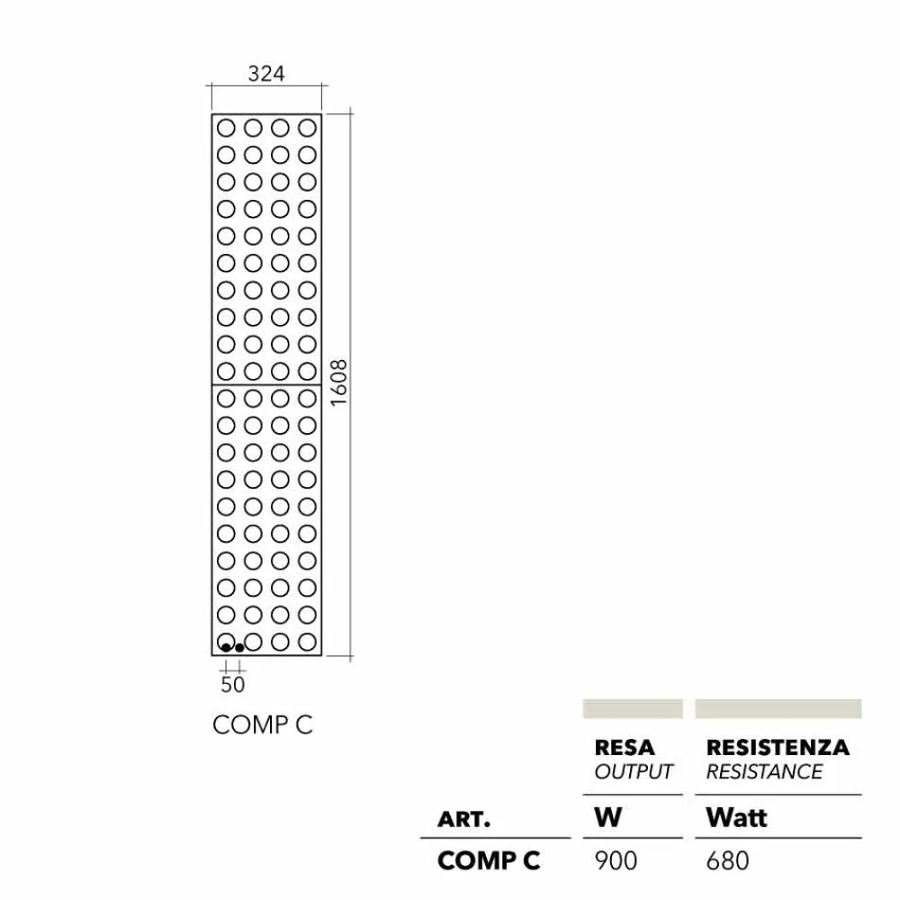 | Maße | L. 324 mm, H. 1608 mm, Achsabstand 50 mm; Wärmeleistung 900 Watt |