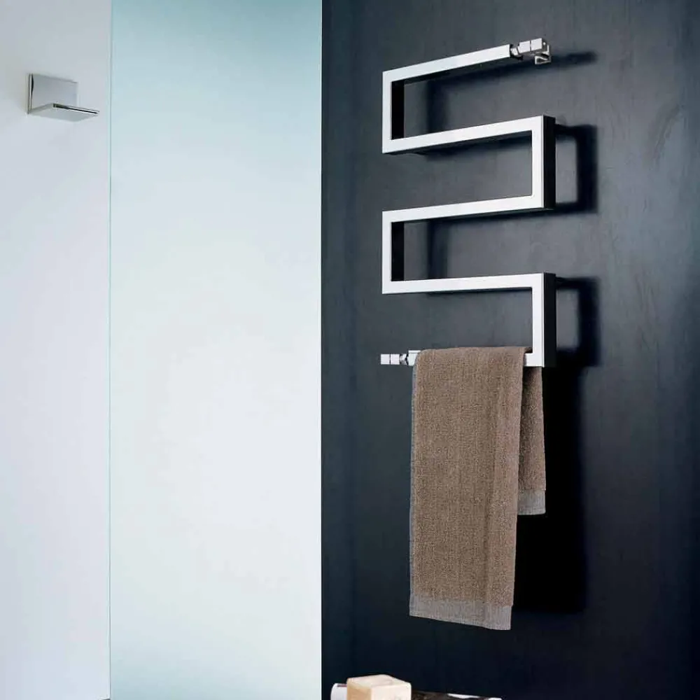 Handtuchheizkörper aus Chromstahl, in der hydraulischen Ausführung. Eine Kollektion mit starkem grafischen Zeichen. Form, Material, Funktion und Technologie schaffen nicht mehr nur einfache Handtuchwärmer, sondern echte Einrichtungselemente.