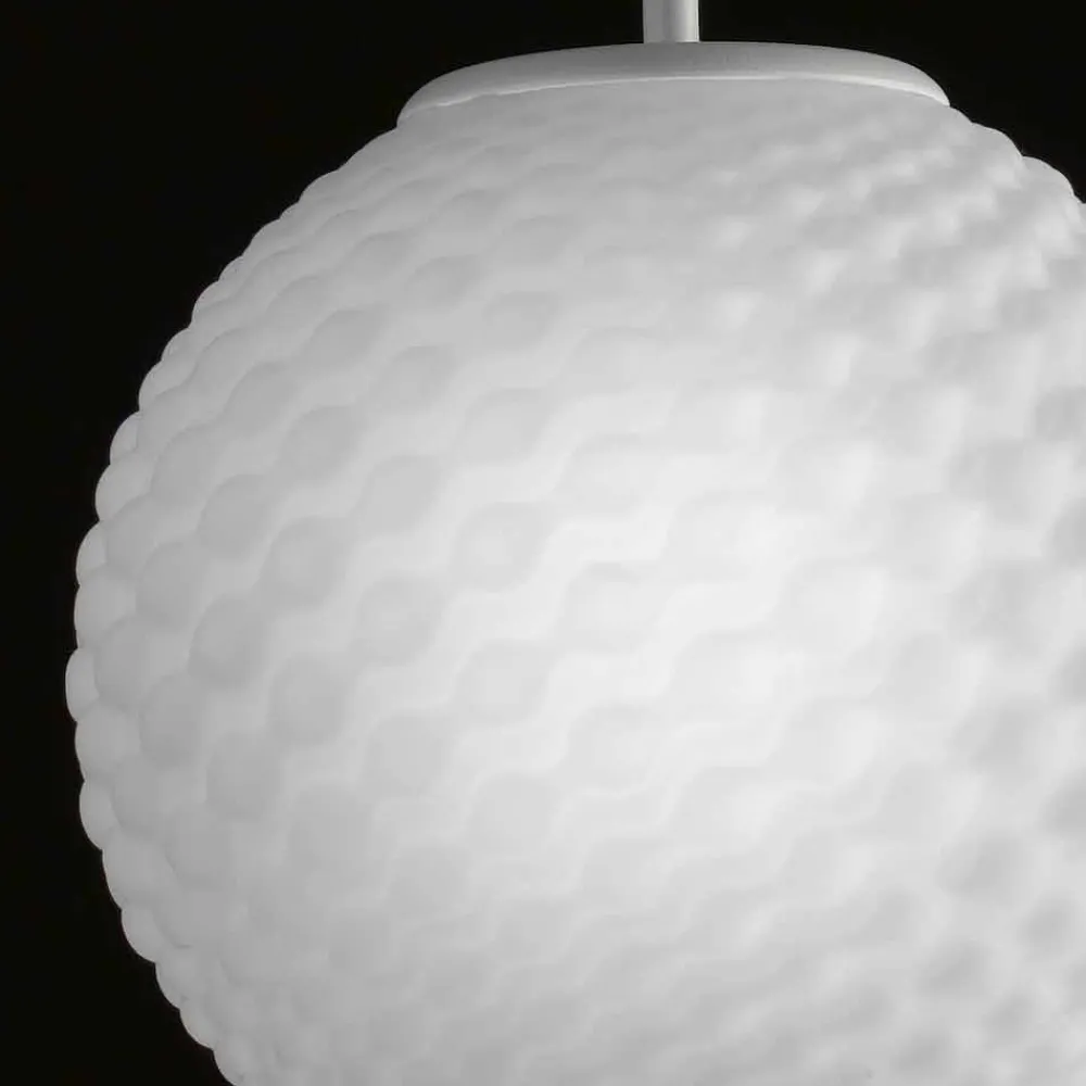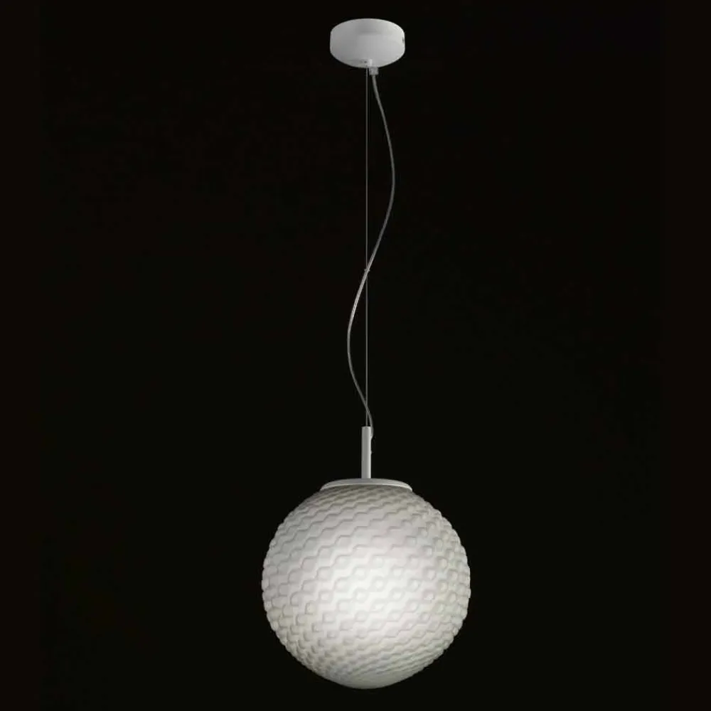 Domino ist eine reichhaltige Kollektion von Lampen aus mundgeblasenem Glas mit einer speziellen alveolaren Prägung, die das Glas selbst verschönert. Der Diffusor kann zylindrisch in zwei Größen und kugelförmig in einem sein, außerdem ist er in drei Farben erhältlich: Satinweiß, Bernstein und Rauch; und vorbereitet für den Gebrauch von 1 70W E27 Birne.