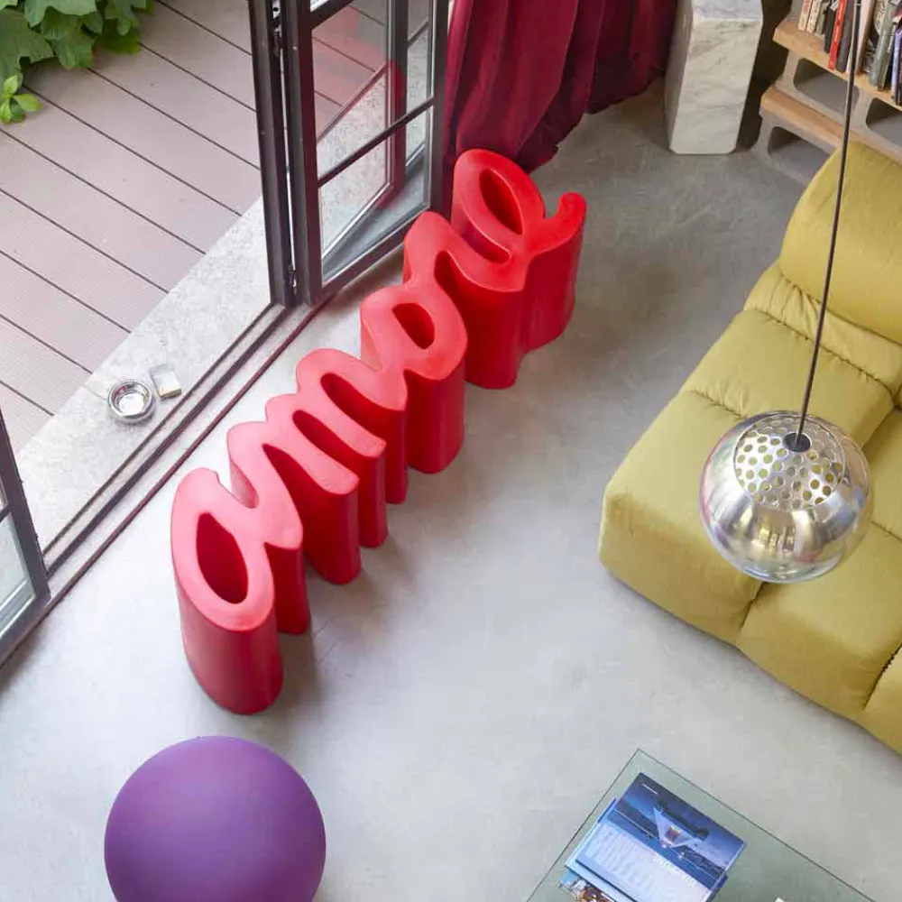 Amore ist eine Bank mit einer starken visuellen Wirkung, die sich für Innen- und Außenumgebungen eignet. Seine Philosophie ist von der „Schrift“ inspiriert, bei der ein Wort materialisiert wird und einem Produkt Gestalt verleiht, das eine Botschaft vermitteln kann.