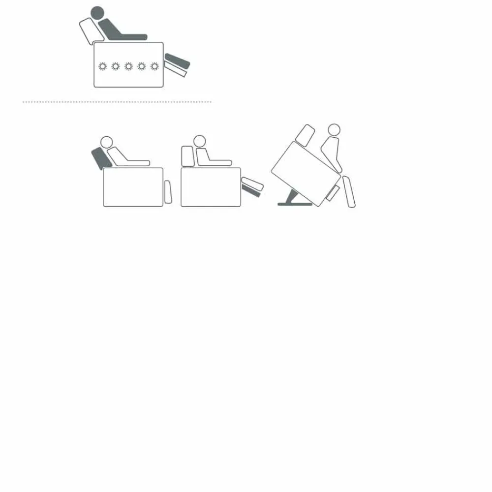 Mechanismen einen oder zwei Motoren, die Bewegung von Trittbrett und zurück abwechselnd autonomen oder selbständigen, Hubfunktion, alzapersona Vorrichtung , die die aufrechte Position, Vibromassage für eine angenehme verteilte Wirkung auf der Rückenlehne, Sitz und Fußteil, automatisch oder motorisierte Bewegung problemlos übernehmen kann, sind Das sind die Möglichkeiten und die entwickelten Kombinationen: eine harmonische Lösung für alle Bedürfnisse.