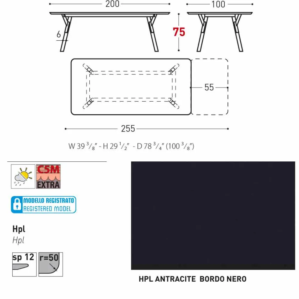 - 100×200/255xH75 cm – 1 Platte ausziehbar bis 55 cm