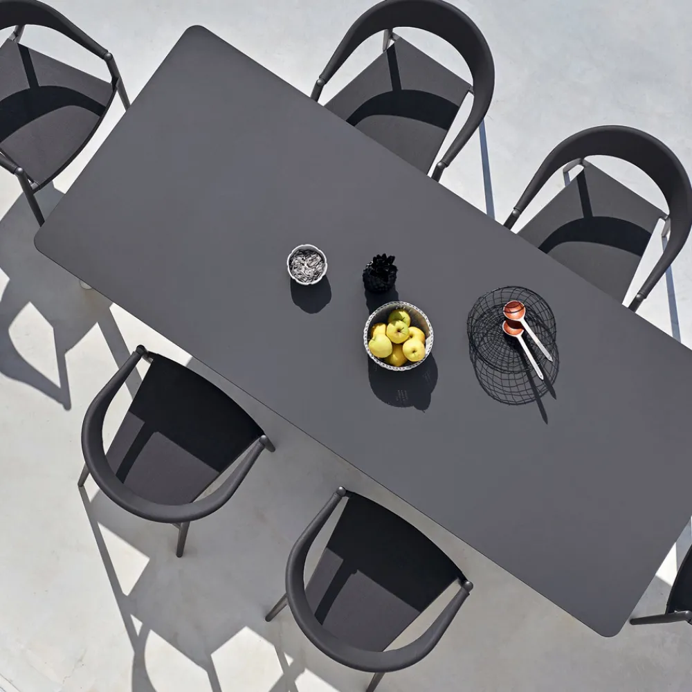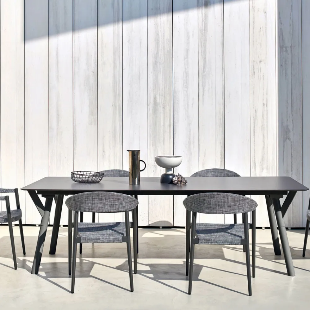 Link ist ein moderner Designtisch mit Struktur (Klammer + Beine) aus lackiertem Edelstahl. Die Platte ist in HPL (Stärke 12 mm) oder in Teakholz (Stärke 30 mm) erhältlich. Dank seines vielseitigen Designs kann er sowohl als ausziehbarer Outdoor-Tisch als auch zur Einrichtung von Innenräumen verwendet werden. Es sind verschiedene Ausführungen erhältlich, mit denen die Struktur, die Beine und die Tischplatte individuell gestaltet werden können.