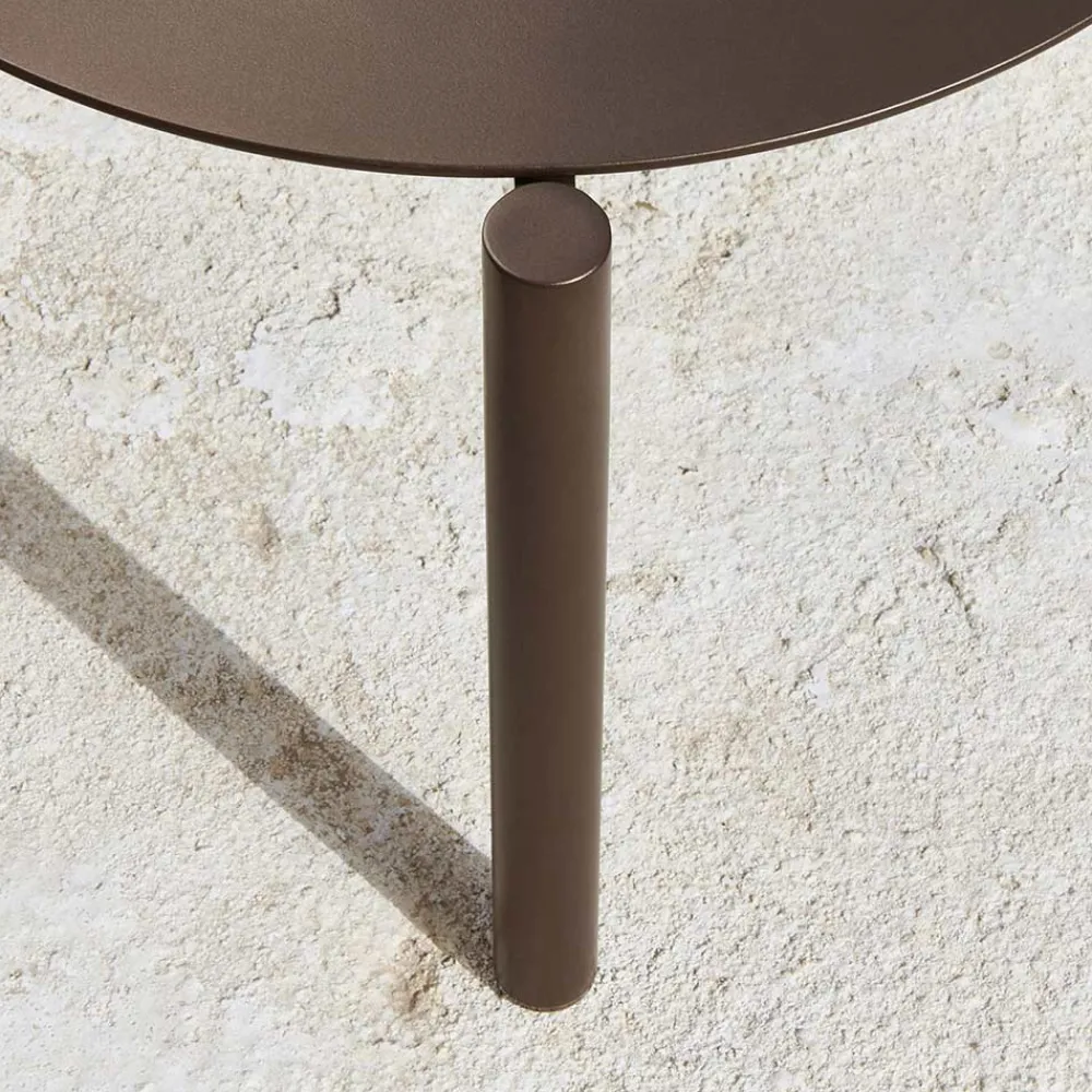 Runder Outdoor-Couchtisch mit Sockel aus lackiertem Aluminium.