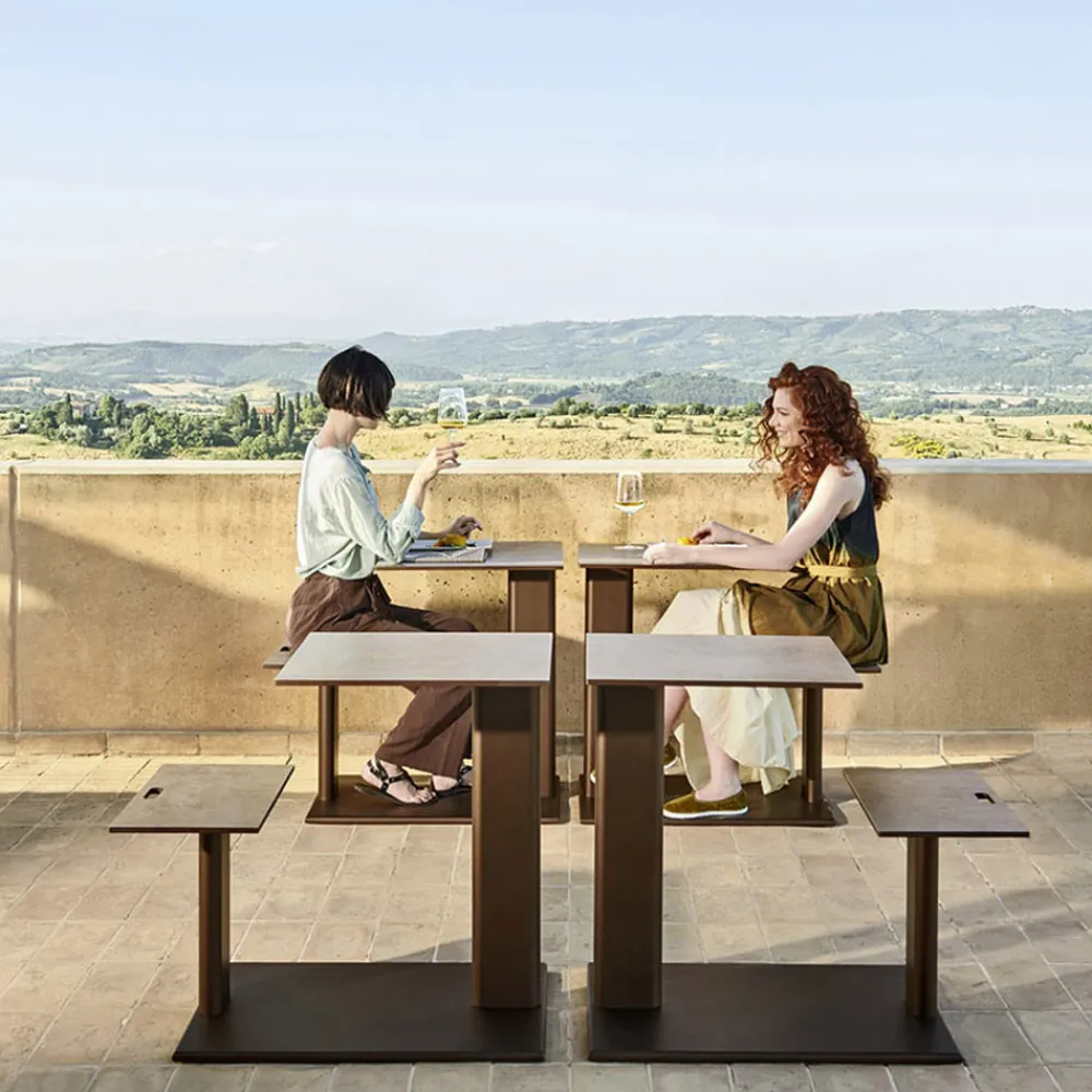 Tisch mit verbundener Sitzfläche aus Aluminium und Platte aus farbigem HPL Made in Italy.