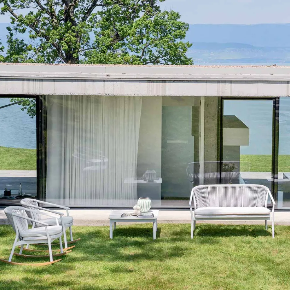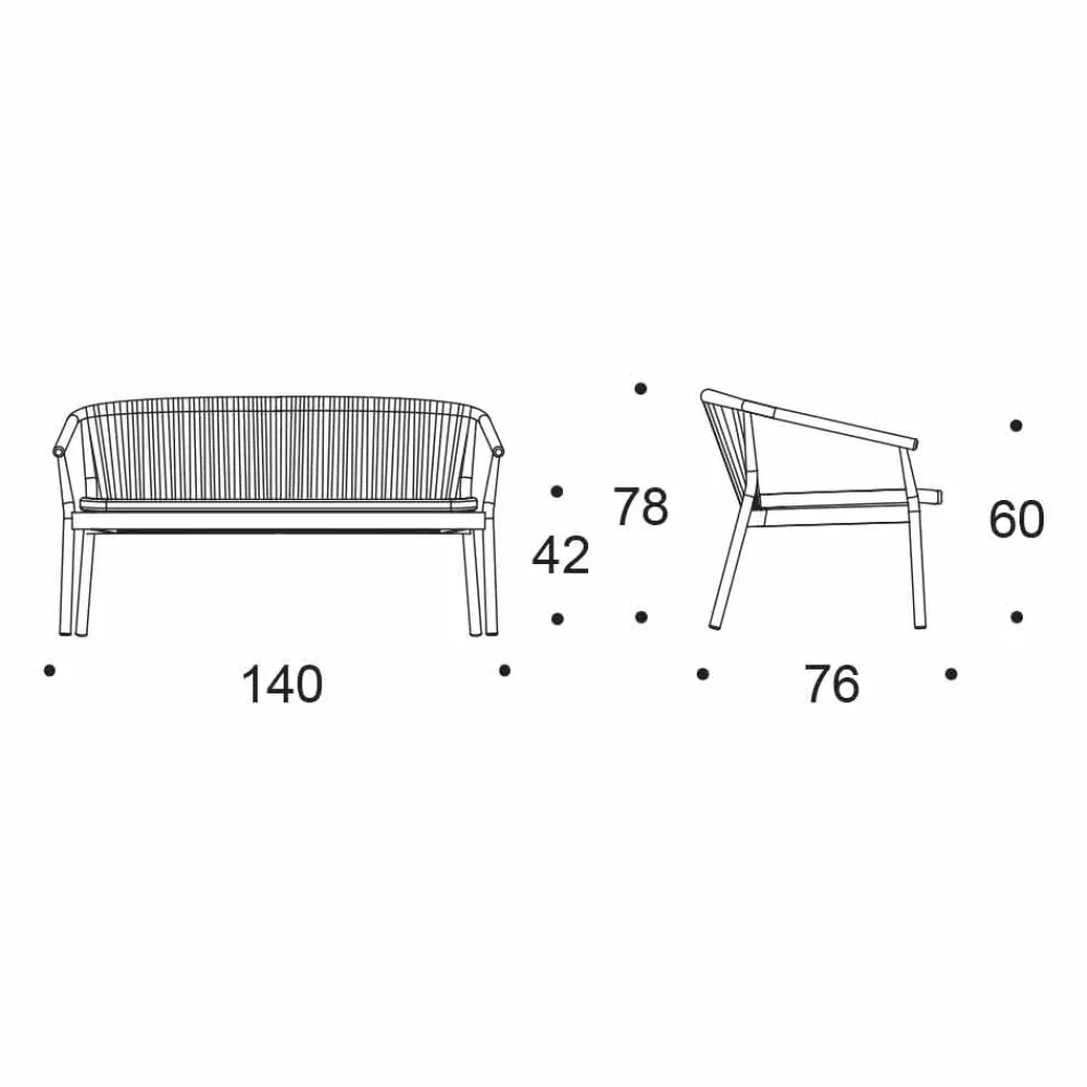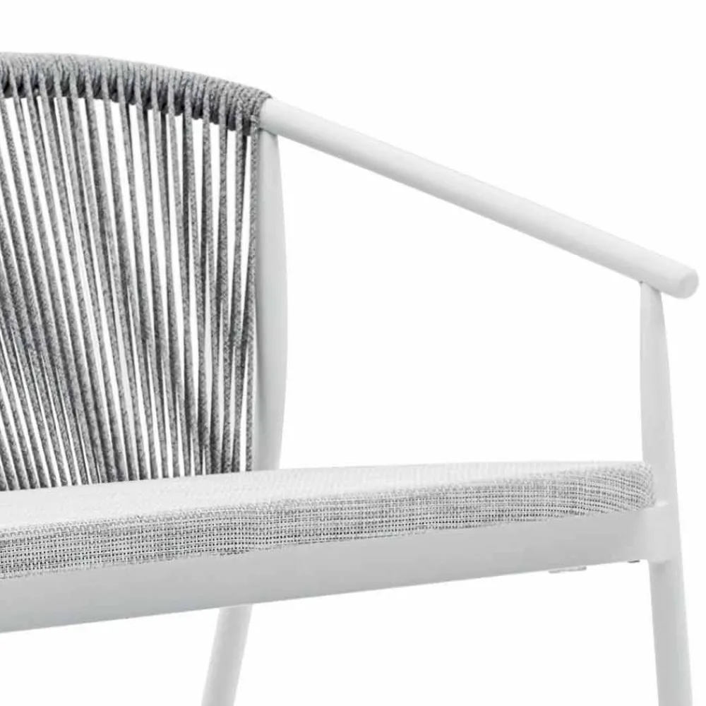 Die Verflechtung der Rückenlehne mit synthetischer Kordel VAR # TEX verbessert die Ästhetik dieses Sofas, das für Tage im Freien in Gesellschaft konzipiert wurde.