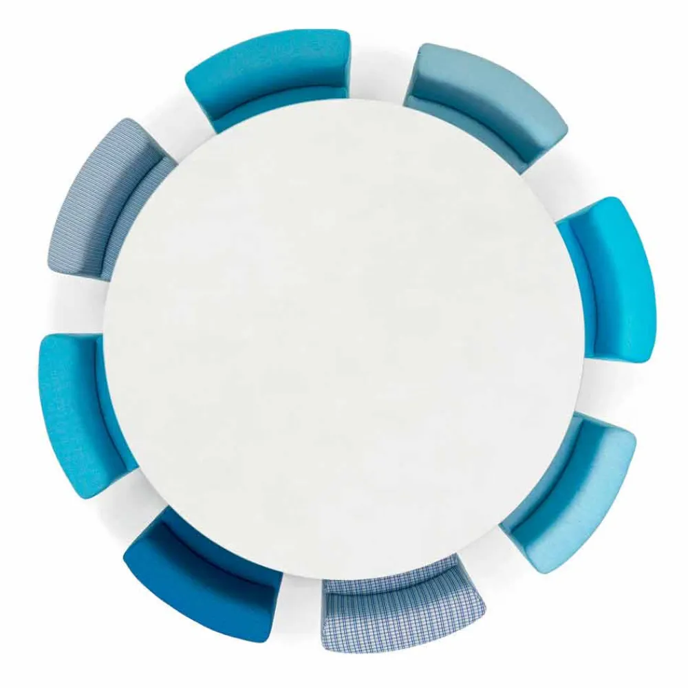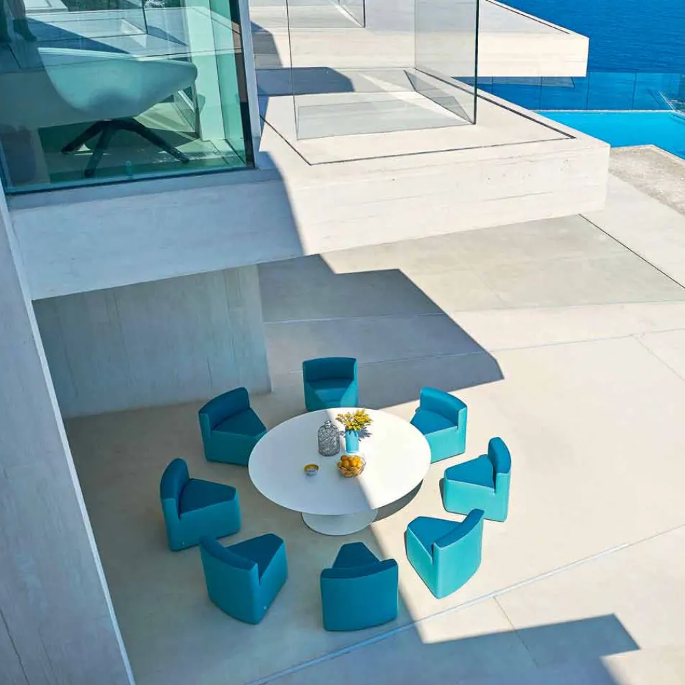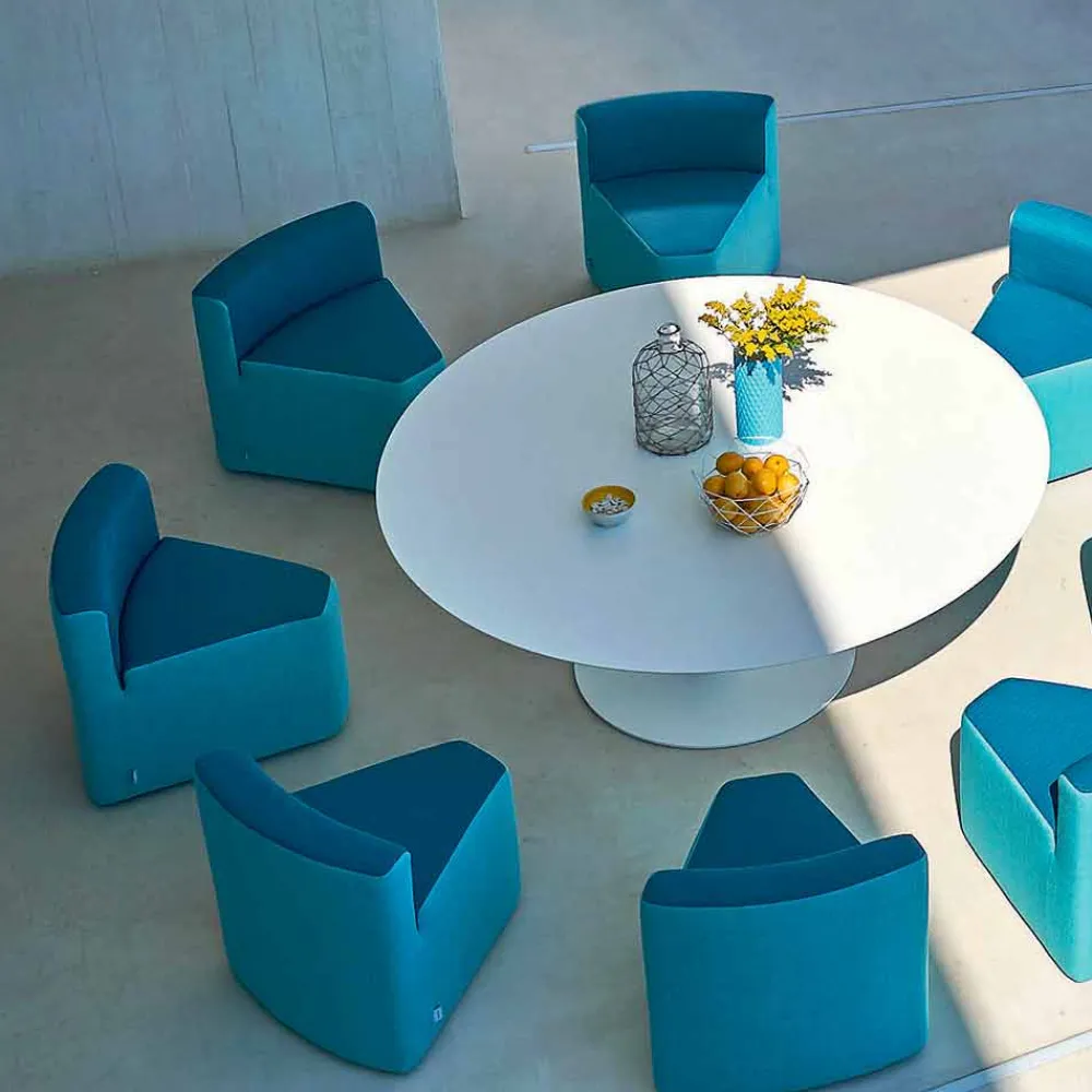 Varaschin Big&Out Outdoor Lounge Set für Garten, Bars und Restaurants. Das Lounge Set ist mit einem runden Esstisch und 8 keilförmigen Sesseln ausgestattet, die sich von innen nach aussen und umgedreht ausziehen lassen, um bei Nichtbenutzung Platz zu sparen.. Der Tisch besteht aus einer HPL Tischplatte mit einem Tischrand von 12 mm Dicke.
