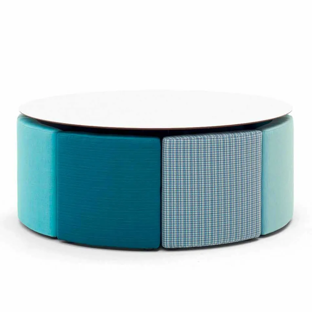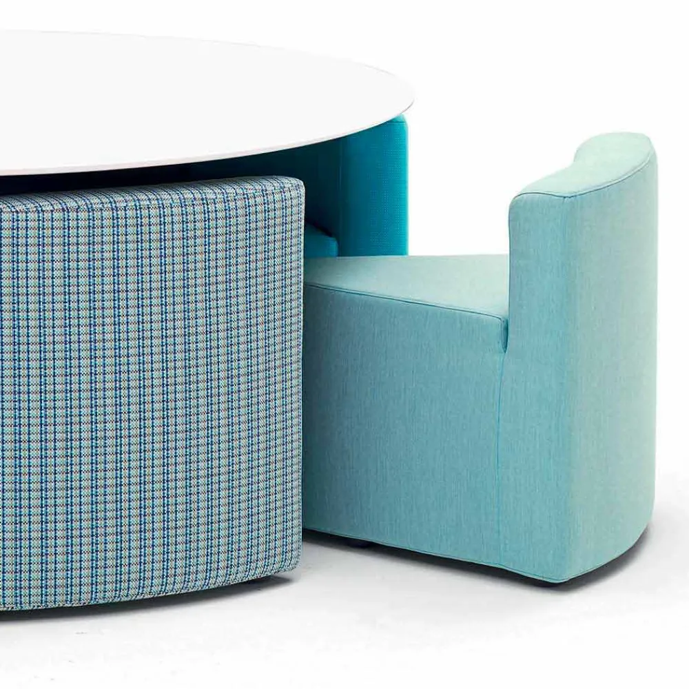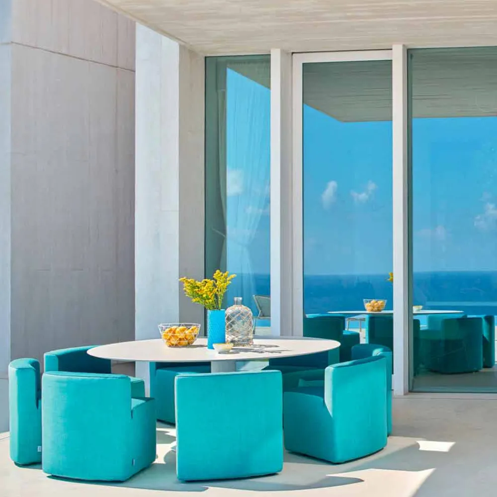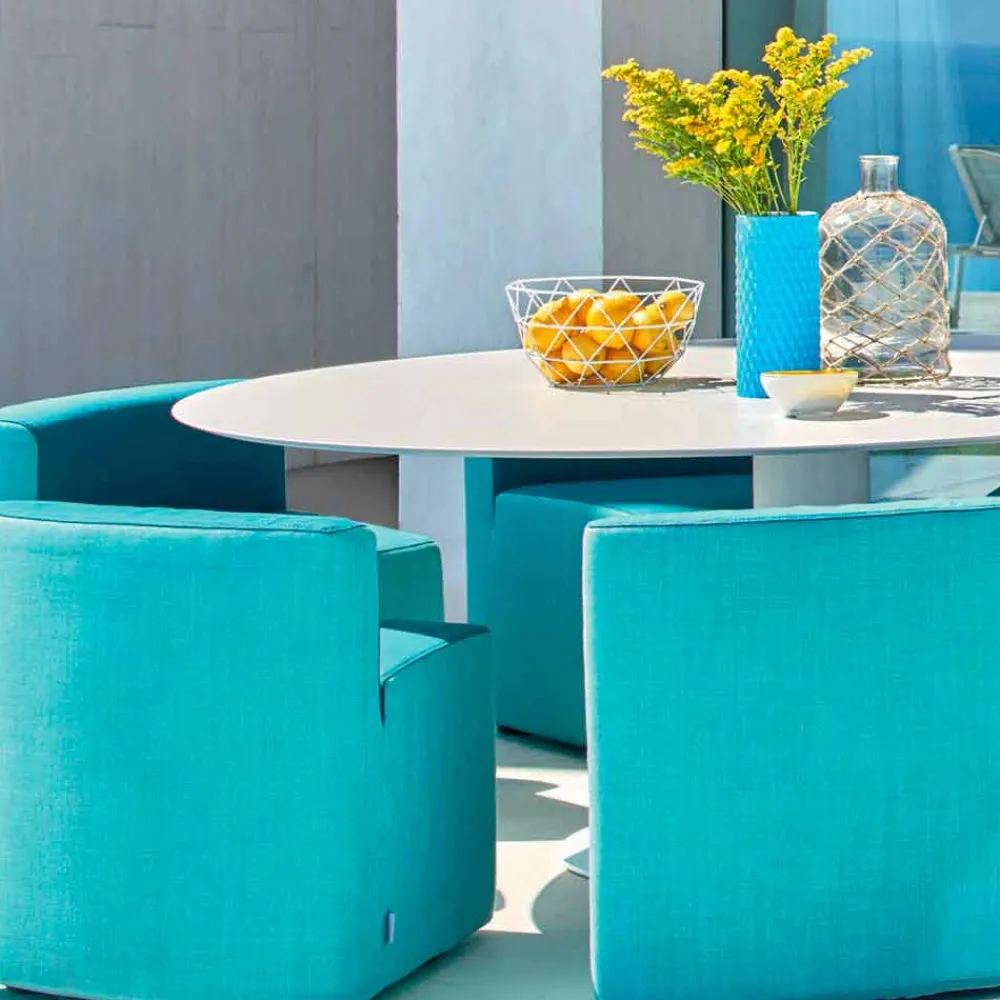 Mit diesem einmaligen Outdoor Lounge Set lassen sich kleine und große Gartenfeste in gemütlicher Runde ausführen. Doch nicht nur auf Gartenfesten geben Sie ein absolutes Highlight, sondern auch in Bars, Restaurants und maritimen Zonen lassen sie sich einwandfrei einsetzen. Der italienische Designer hat sich dabei einiges ausgedacht, nicht nur das platzsparende *Know how* mit dem sich die keilförmigeen Sessel schnell unter dem Tisch zusammenfügen lassen und so für Ordnung sorgen, sondern auch mit seinen handgewebten Polsterbezug.