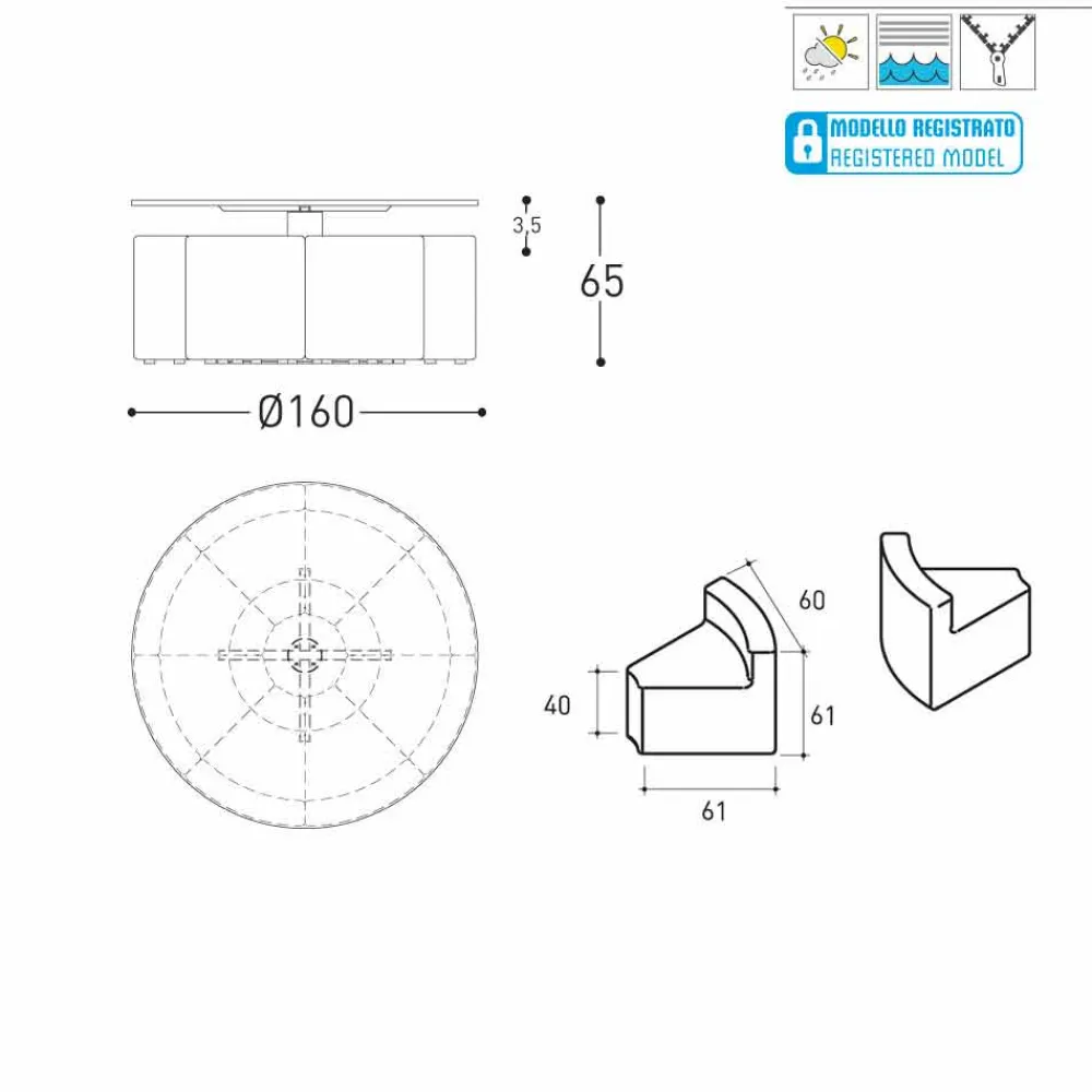 | Maße | Tavolo : diametro 160xH65 cm ; Poltroncine : diametro 160xH61 cm |