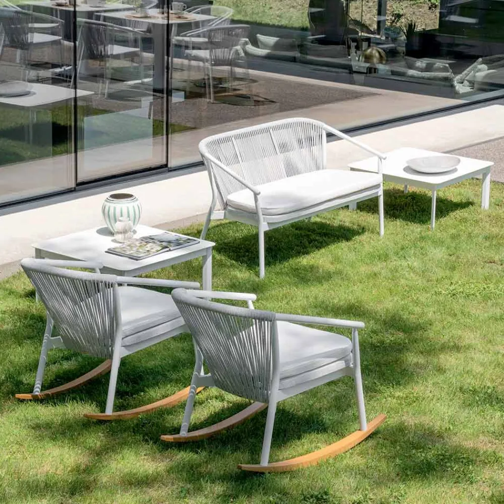 Schaukelsessel im modernen Design für den Außenbereich mit Massivholzbasis und Sitz aus weißem oder aschefarbenem technischen Stoff.