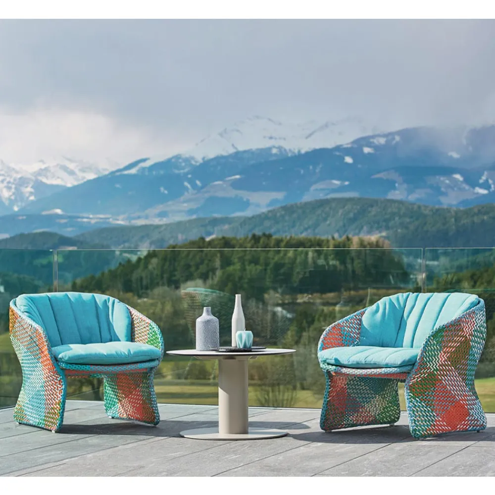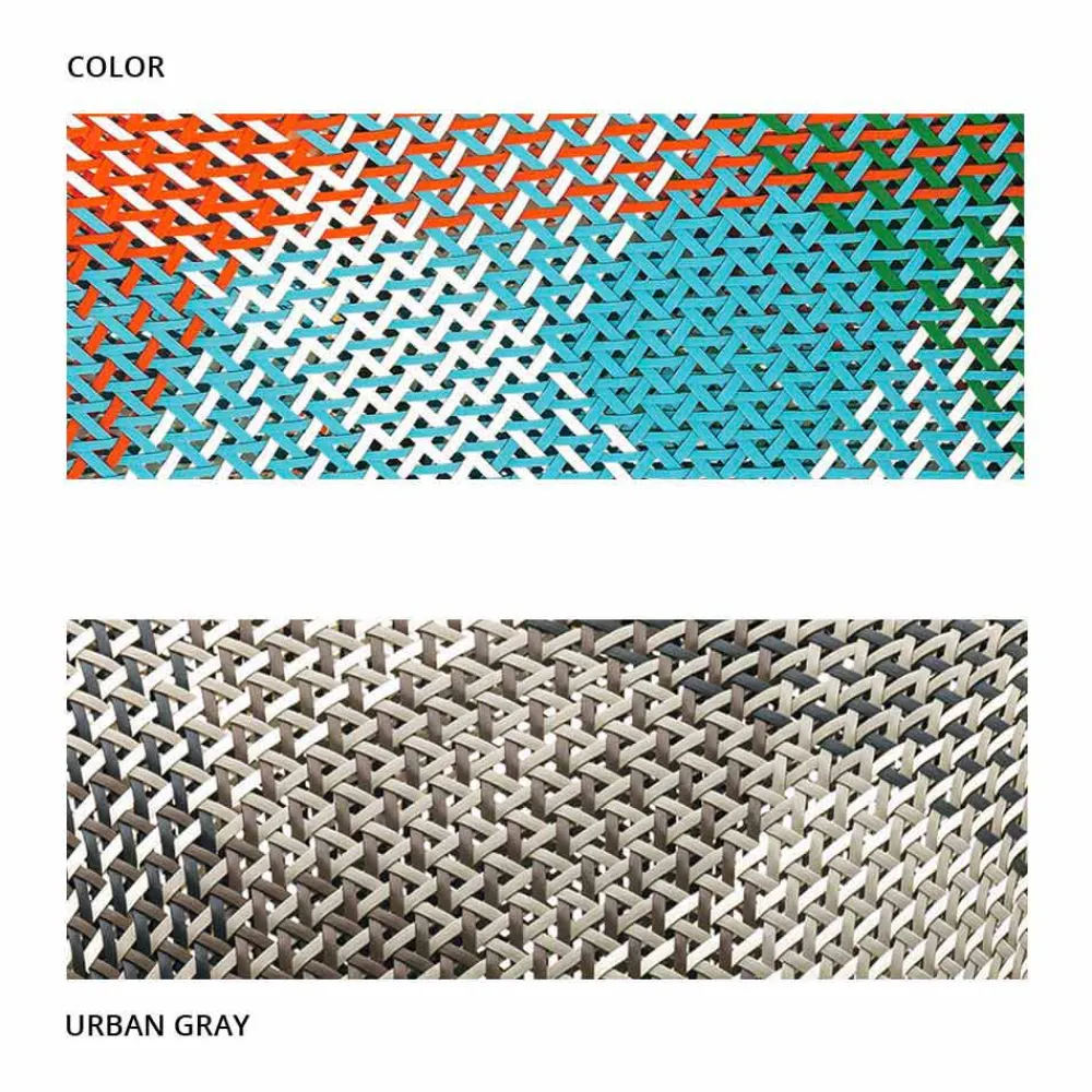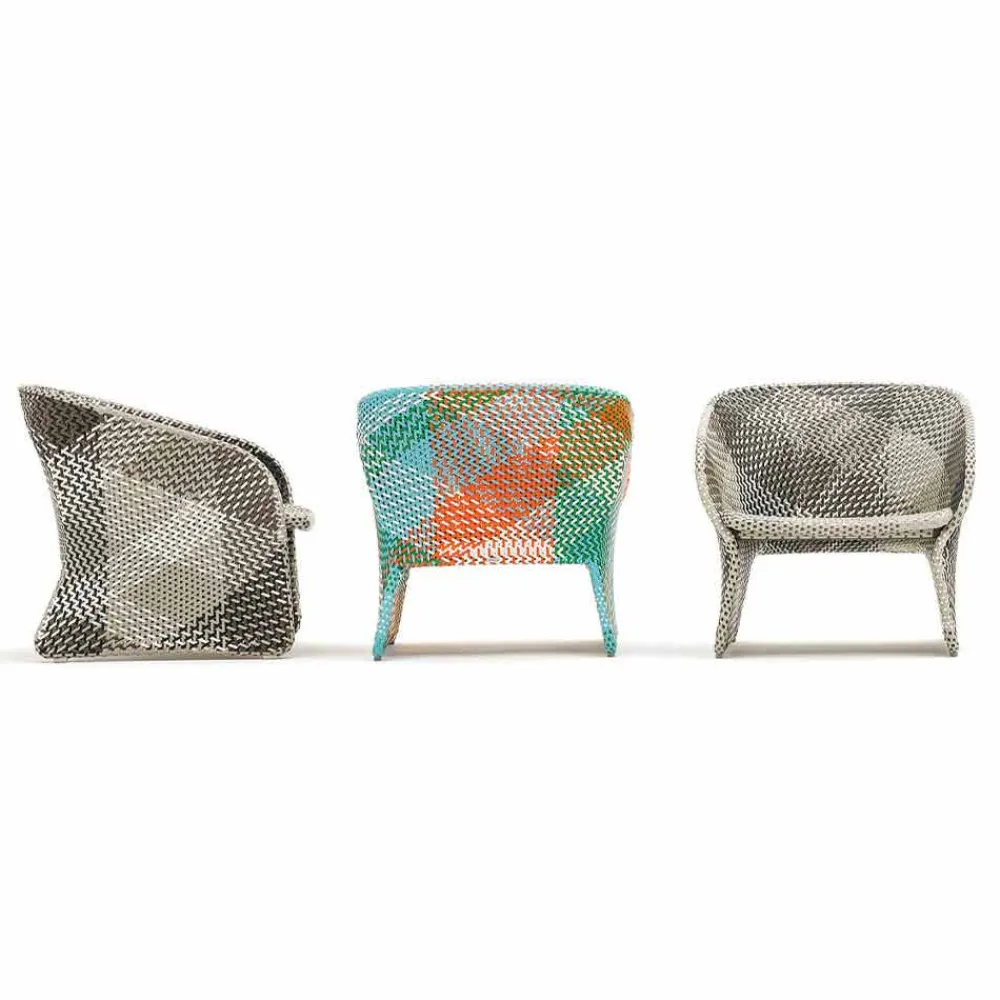 Der Maat Garden Lounge Sessel ist einladend und funktional: Seine Struktur aus pulverbeschichtetem Aluminium ist in ein breites Gewebe mit einem dreieckigen Motiv eingewickelt, das aus Streifen synthetischer Fasern unterschiedlicher Farbe besteht, die einen dynamischen chromatischen Hintergrund erzeugen. Die Volumina sorgen für maximale Stabilität und hervorragende Unterstützung von Rücken und Armen.