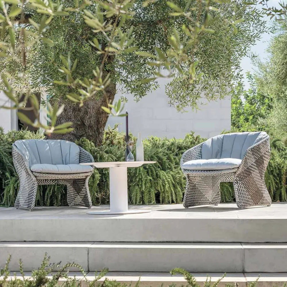 Hochwertiger Gartensessel aus gewebter Kunstfaser, Rahmen aus lackiertem Aluminium und Kissen aus gepolstertem Stoff.