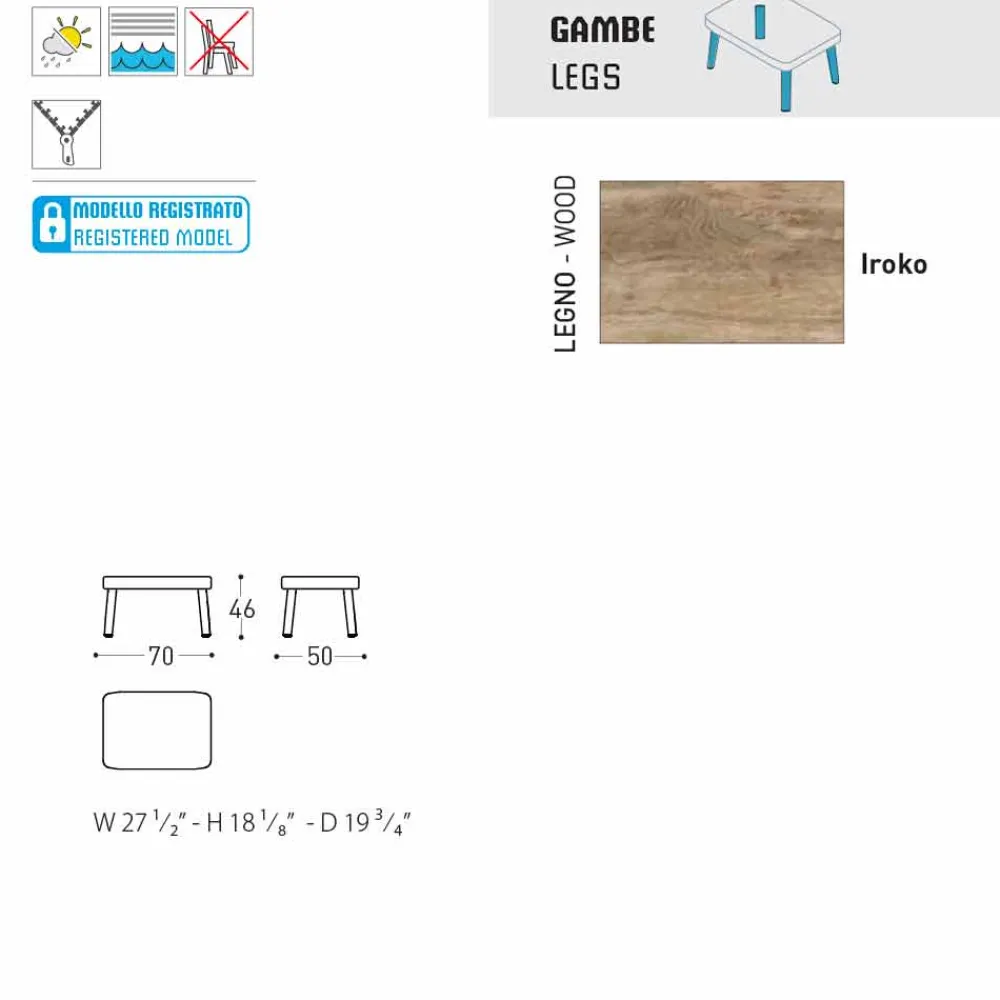 Emma ist eine schöne Garten-Fußstütze. Gekennzeichnet durch eine Struktur aus massivem Irokoholz und eine Sitzfläche aus Dryfeel-Gummi gepolstert und mit Stoff überzogen.