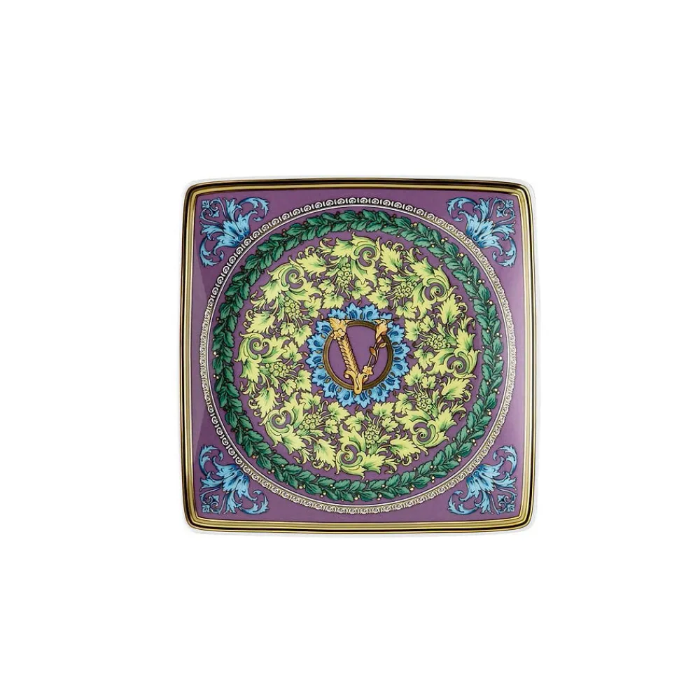 Die Barocco Mosaic-Schale von Versace aus feinem Porzellan ist eine atemberaubende Hommage an italienische Kunst und Luxus . Ihr faszinierendes Design zeichnet sich durch ein kompliziertes Barockmosaik aus, das durch kräftige Lila-, Grün- und Blautöne bereichert wird, die sich harmonisch um das zentrale Versace-„V“ schlingen. Symbol, ein Sinnbild für Eleganz und Vornehmheit.